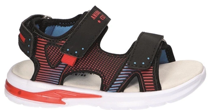 • Czarne sandały dziecięce American Club z czerwonymi detalami i świecącą podeszwą LED. Lekkie, wygodne, zapinane na rzepy. Idealne na lato – do zabawy, spacerów i codziennego użytku.