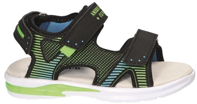 - Czarne sandały dziecięce American Club z zielonymi wstawkami i świecącą podeszwą LED. Lekkie, wygodne, zapinane na rzepy. Idealne na lato – do zabawy, spacerów i codziennego noszenia.