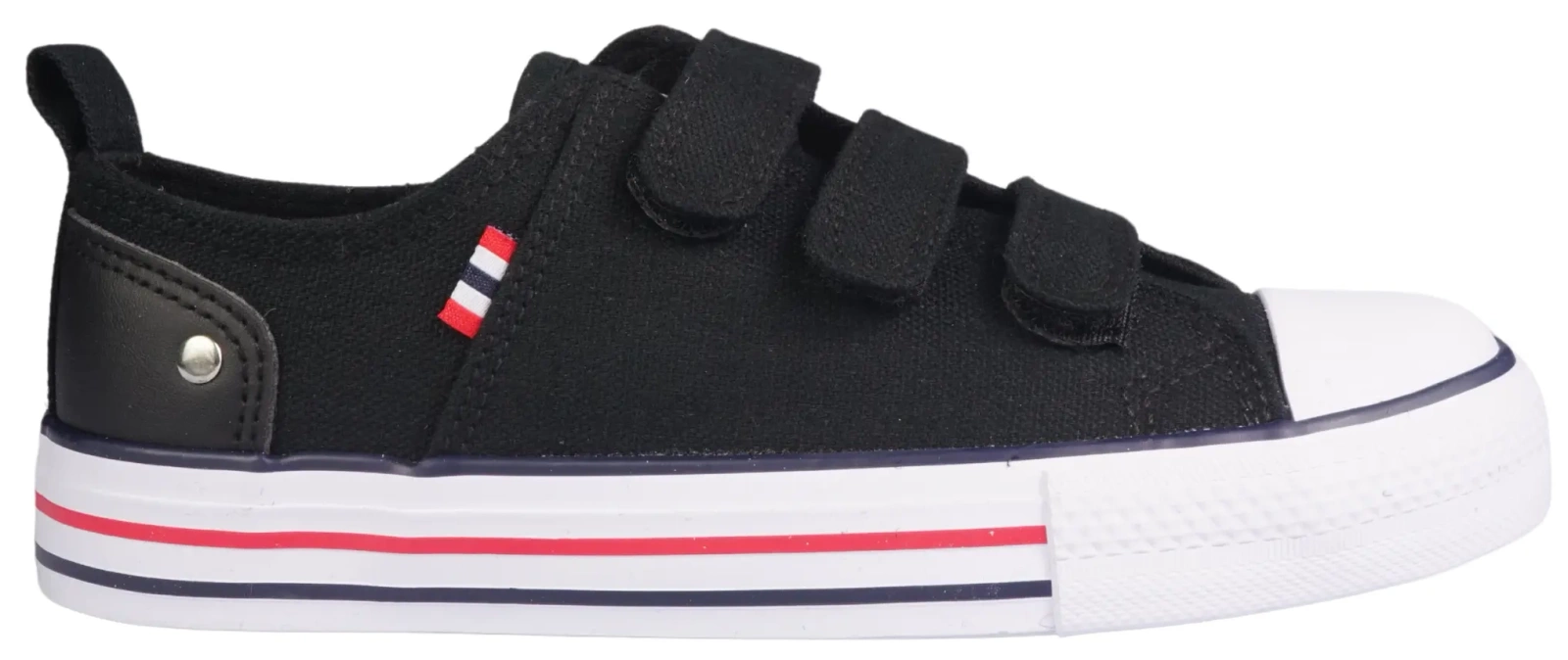 Tenisówki dziecięce w kolorze czarnym, których producentem jest firma American Club. Zostały wykonane z materiałów tekstylnych o bardzo wysokiej jakości, model jest solidny, schludnie wykonany i dobrze leży na nodze. Obuwie posiada wzmocniony przód oraz obszyty ekoskórą utwardzony zapiętek.  Buty posiadają grubą, gumową podeszwę co zapewnia im trwałość i bardzo dobrą przyczepność do podłoża. Tekstylne wnętrze tenisówek dziecięcych na rzep jest bardzo delikatne i przyjazne dla skóry dzięki czemu noga się nie męczy nawet po korzystaniu z nich przez dłuższy czas. Wkładka jest miękka i wygodna, buty same w sobie są dosyć lekkie i dobrze dopasowują się do stopy dzięki trzem rzepom. Obuwie nada się idealnie do szkoły czy używania na co dzień.