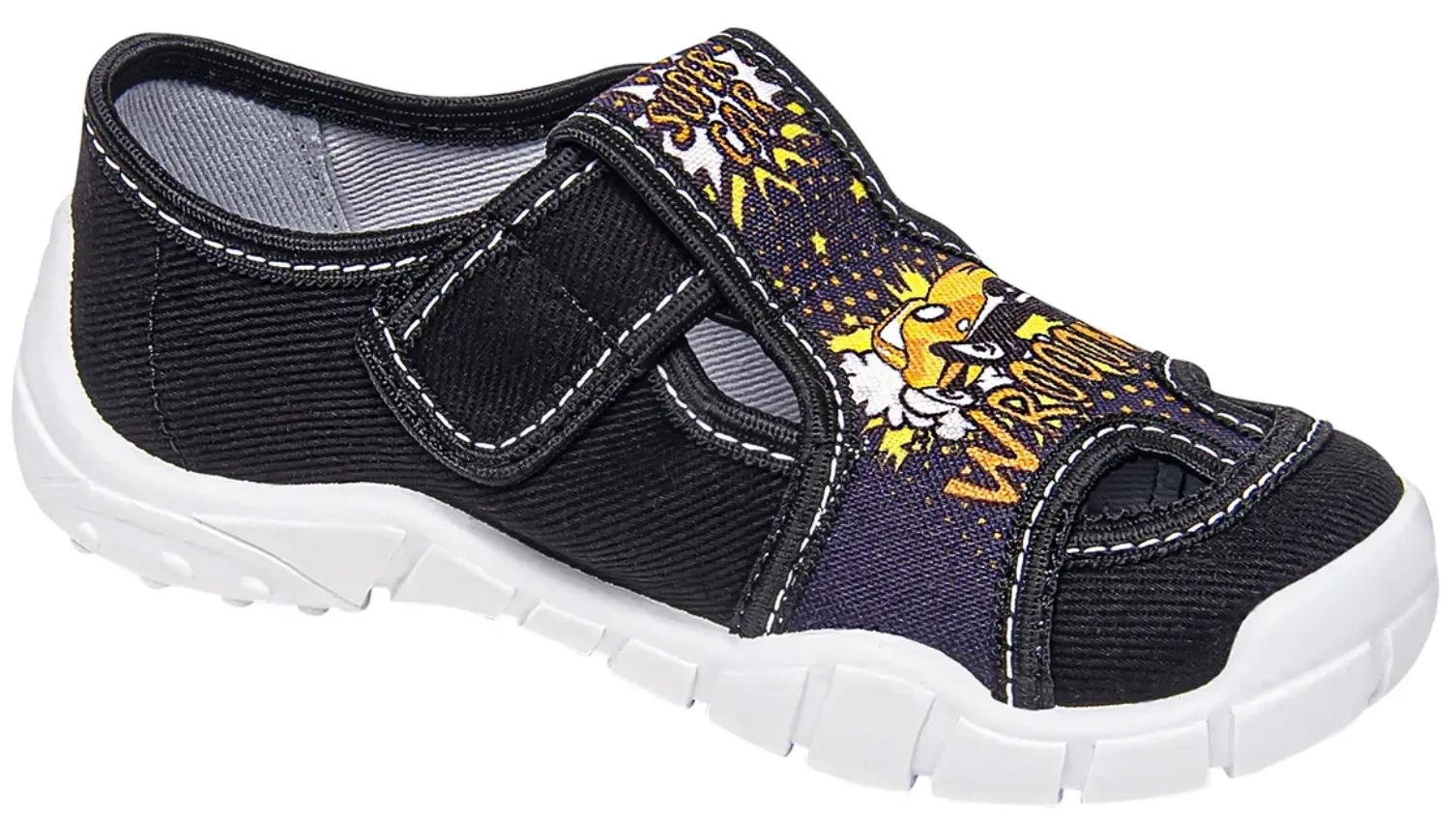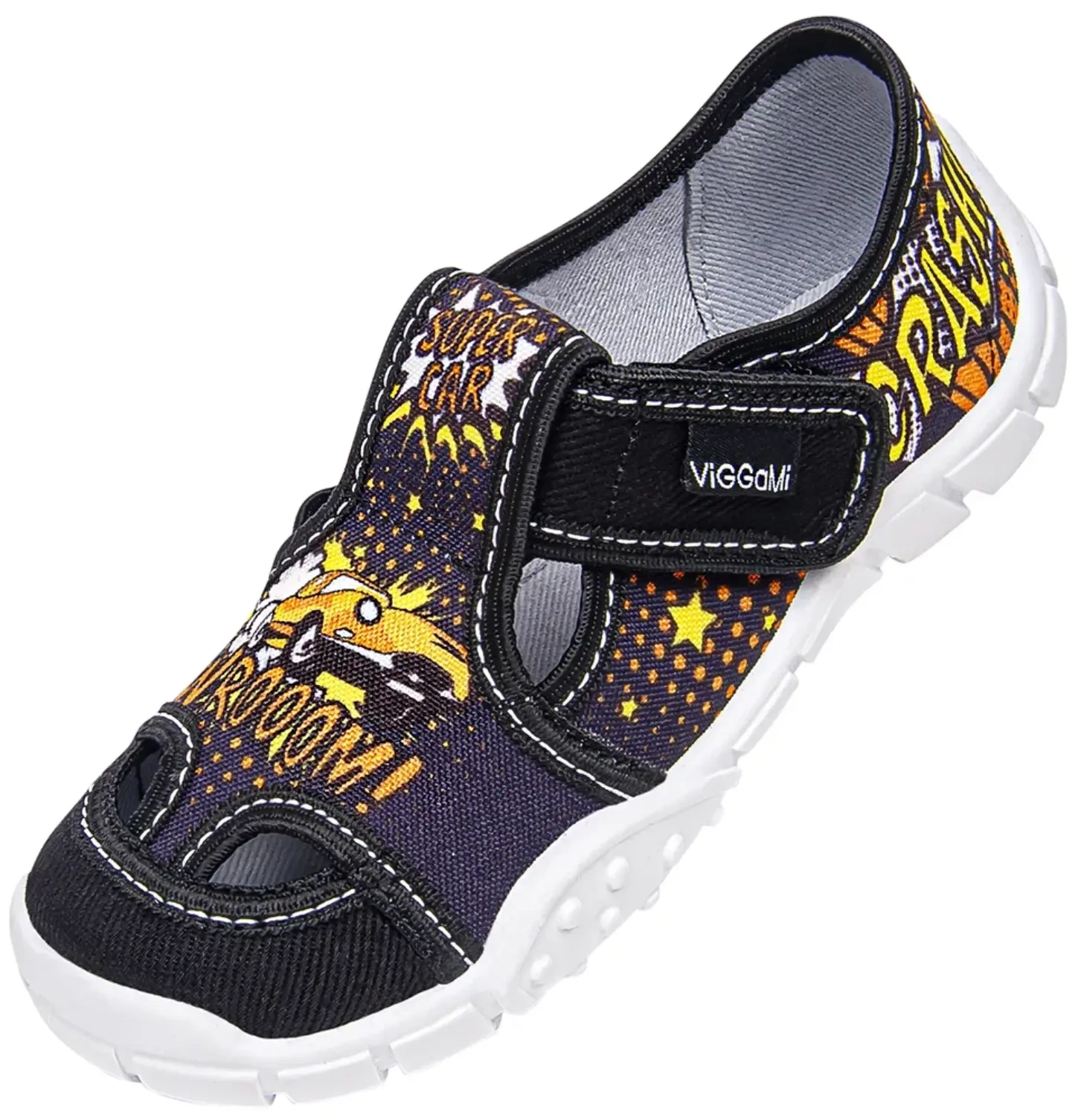 Tenisówki dziecięce Viggami w czarnym kolorze z ciekawą grafiką samochodu na przodzie. Posiadają elastyczną antypoślizgową podeszwę która jest wentylowana od spodu, zapewnia ona wygodę, i bezpieczeństwo naszych pociech. Kapcie są zapinanie na rzep co znacznie ułatwia samodzielne zakładanie obuwia przez dziecko oraz zapewnia idealne dopasowanie się do stopy. Buciki sprawdzą się do przedszkola jak i harcowania po domu. Produkt jest stworzony w Polsce przez firmę Viggami. Kapcie są lekkie wygodne i mają półotwarte noski co jeszcze bardziej poprawia wentylację, dodatkowo posiadają certyfikat zdrowej stopy który zapewnia , że obuwie wykonane jest prawidłowo pod względem konstrukcyjnym, technologicznym i materiałowym oraz prezentuje się estetycznie. Dzięki niemu Rodzice mają pewność, że stópki ich dzieci są bezpieczne i właściwie się rozwijają.