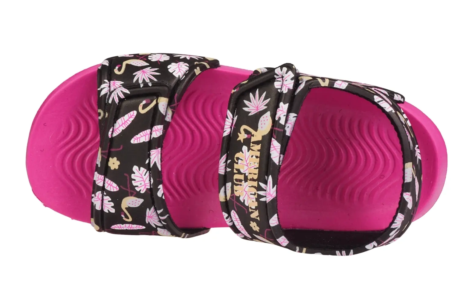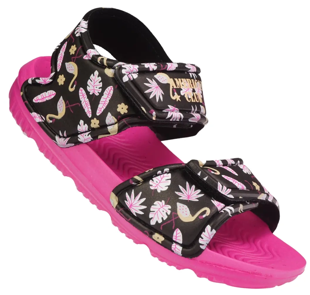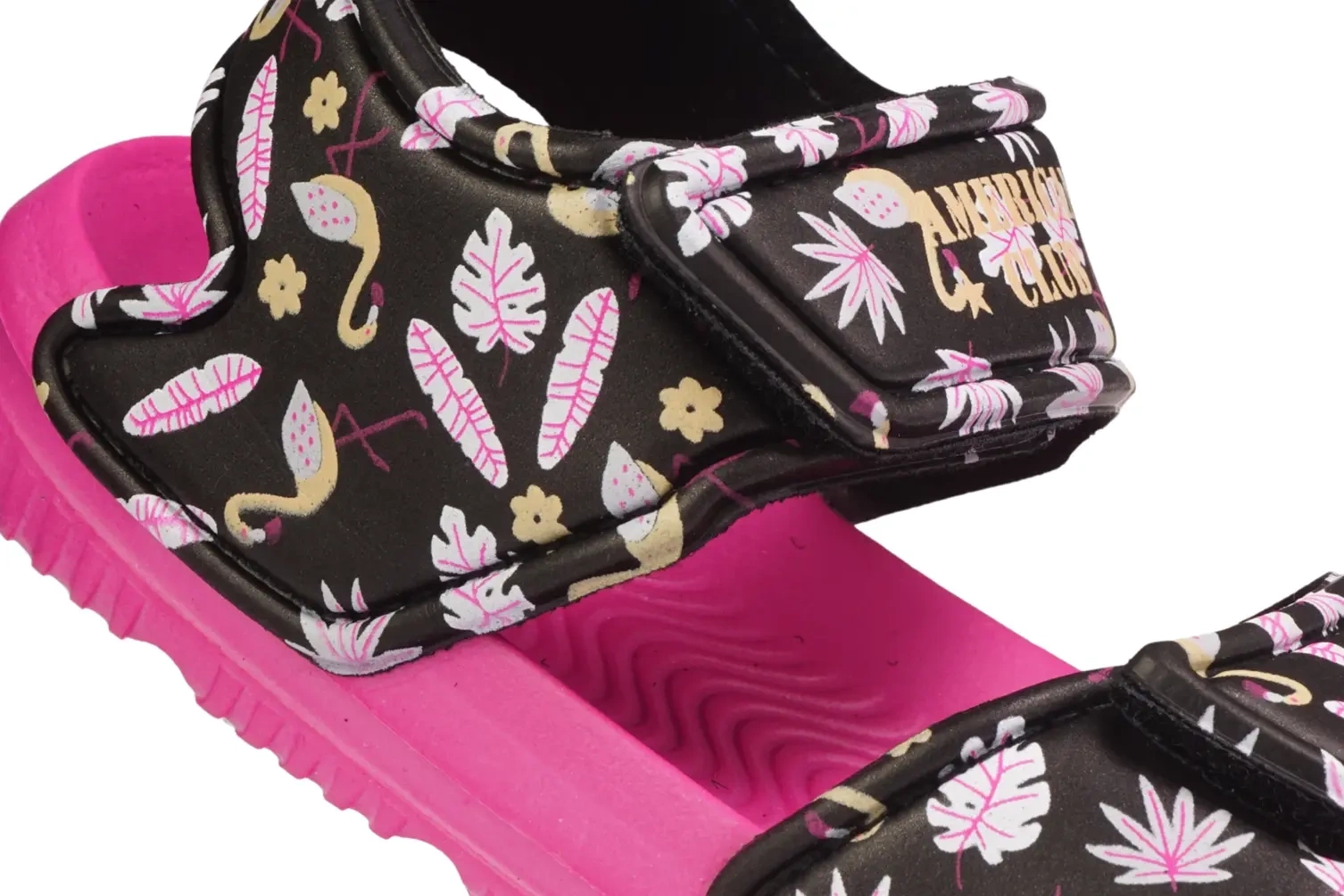 - Dziewczęce sandały piankowe American Club z różową podeszwą i czarnymi paskami w kwiaty. Lekkie, elastyczne i wygodne. Idealne na lato, plażę i codzienne zabawy. Zapięcie na rzep i antypoślizgowa podeszwa zapewniają komfort i bezpieczeństwo.