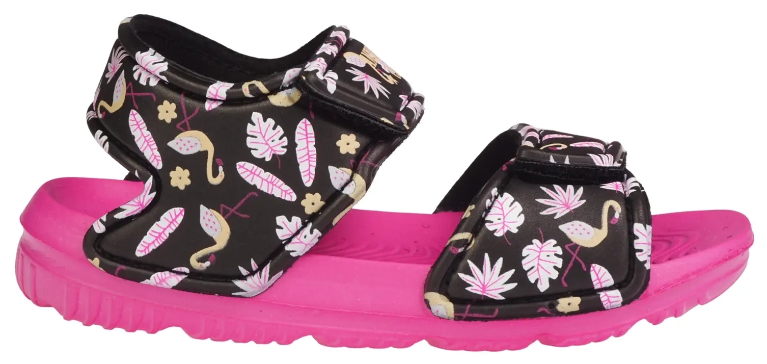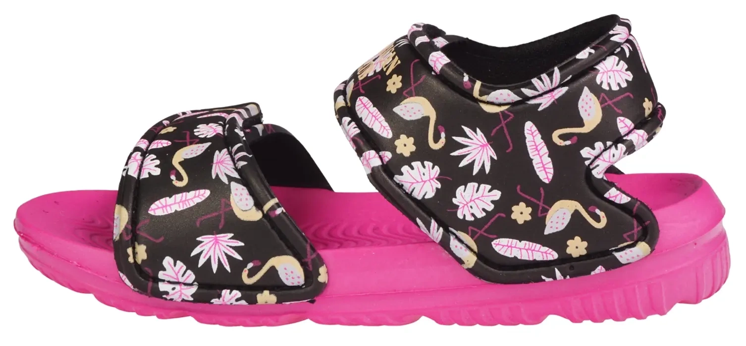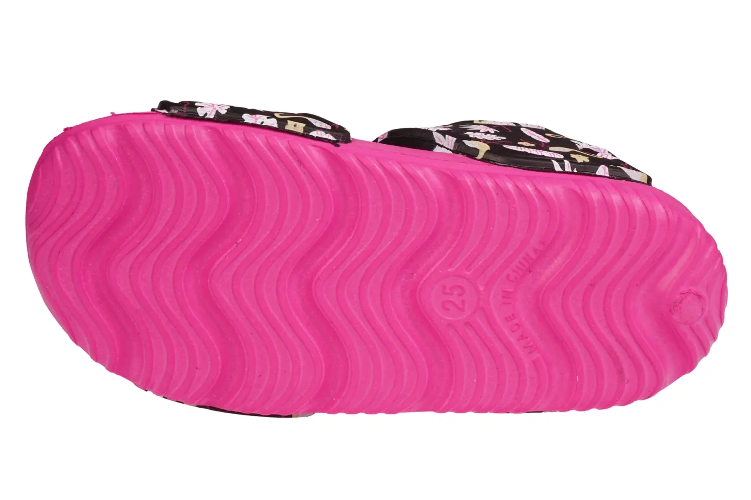 - Dziewczęce sandały piankowe American Club z różową podeszwą i czarnymi paskami w kwiaty. Lekkie, elastyczne i wygodne. Idealne na lato, plażę i codzienne zabawy. Zapięcie na rzep i antypoślizgowa podeszwa zapewniają komfort i bezpieczeństwo.