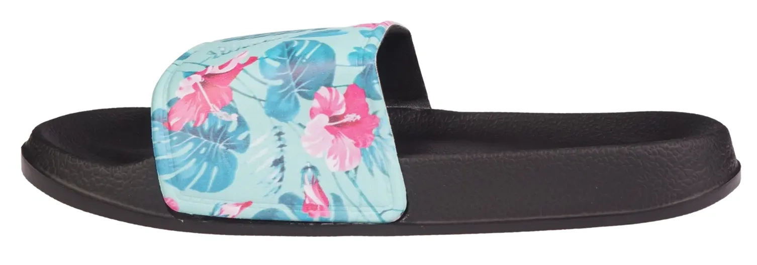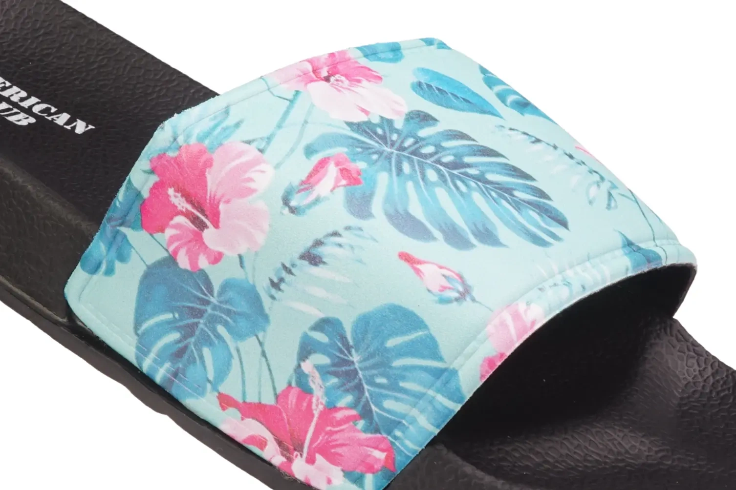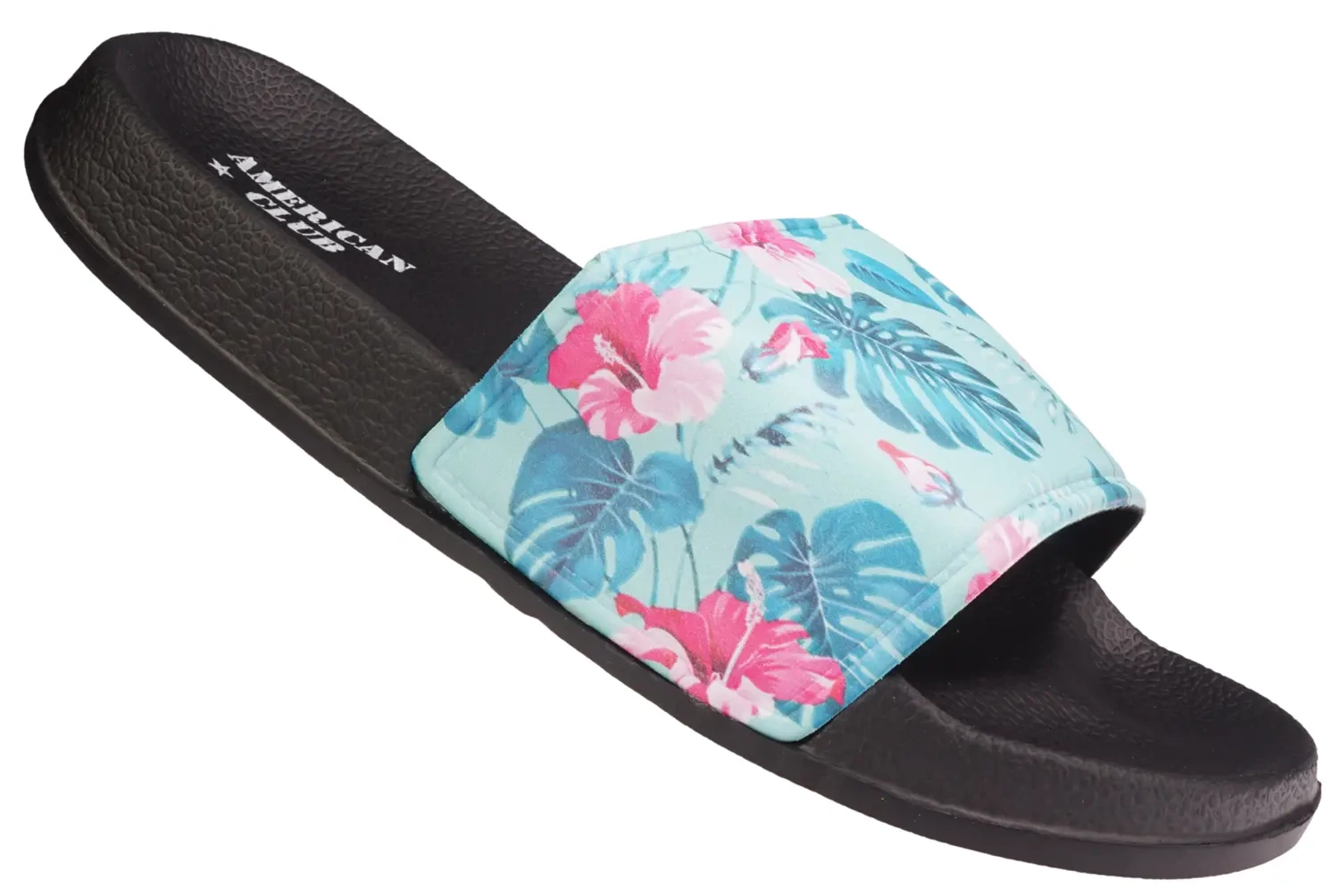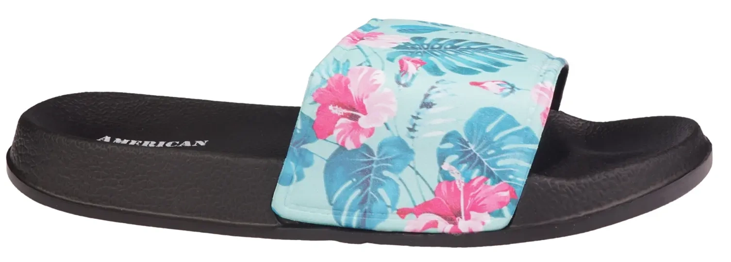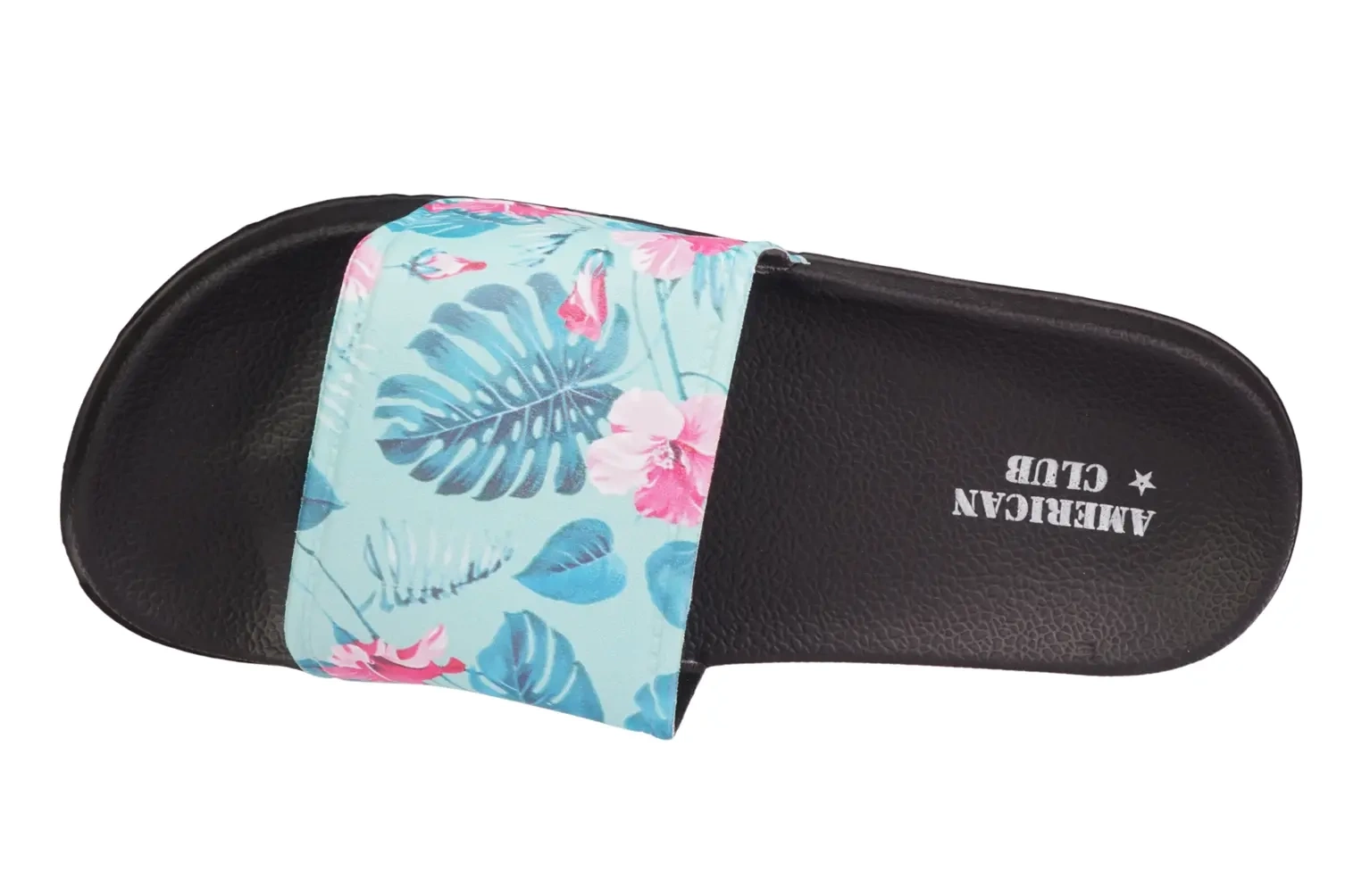 Młodzieżowe klapki basenowe marki American Club z czarną podeszwą i niebieskim paskiem ozdobionym subtelnym motywem kwiatów i liści łączą w sobie styl oraz funkcjonalność. Dzięki zastosowaniu wysokiej jakości pianki, są niezwykle lekkie, miękkie i elastyczne, co gwarantuje komfort nawet podczas długiego noszenia.