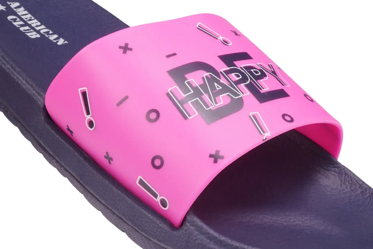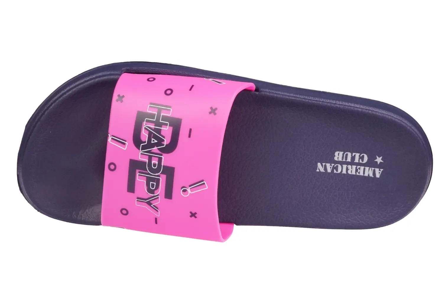 - Młodzieżowe klapki American Club z granatową podeszwą i różowym paskiem z napisem Happy. Lekkie, elastyczne i wygodne. Antypoślizgowa podeszwa idealna na basen, plażę i do codziennego użytku. Dostępne w rozmiarach 37–41.