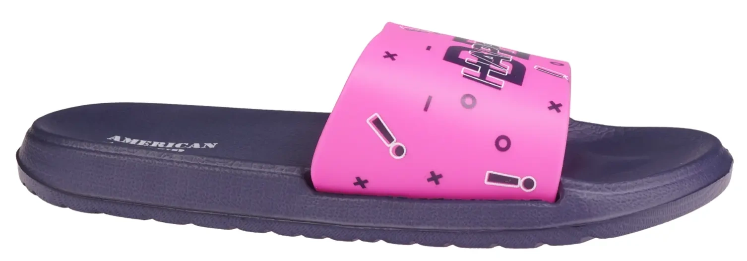 Młodzieżowe klapki basenowe marki American Club z granatową podeszwą i różowym paskiem ozdobionym napisem Happy to doskonałe połączenie stylowego wyglądu i praktyczności. Wykonane z wysokiej jakości pianki są wyjątkowo lekkie, miękkie i elastyczne, co gwarantuje komfort nawet podczas długotrwałego noszenia.