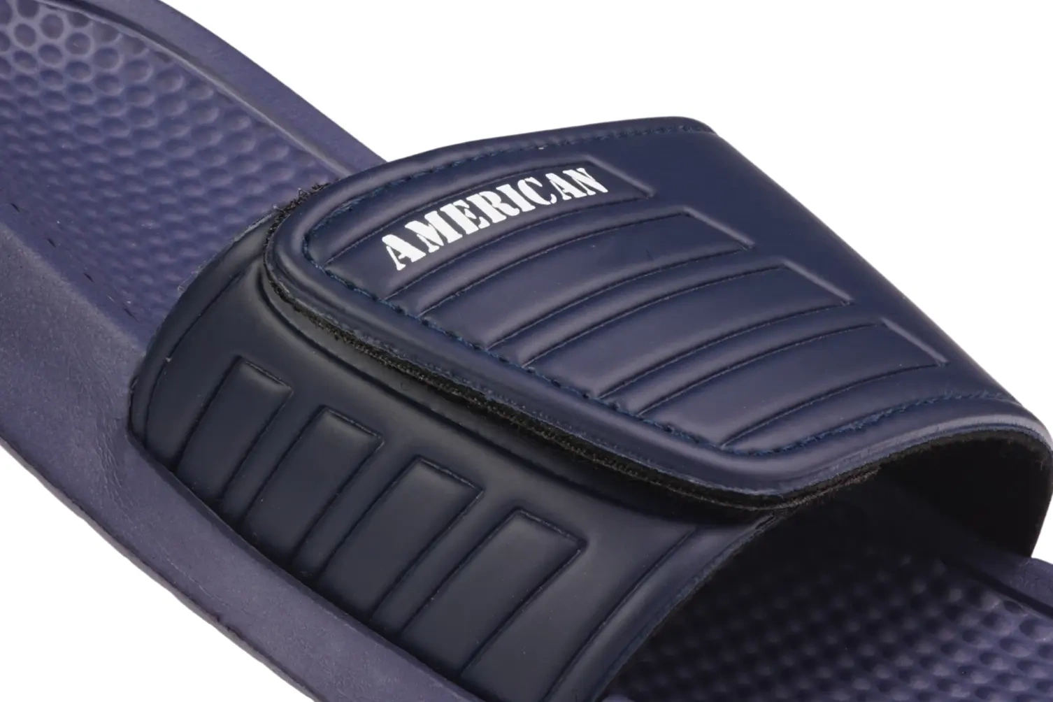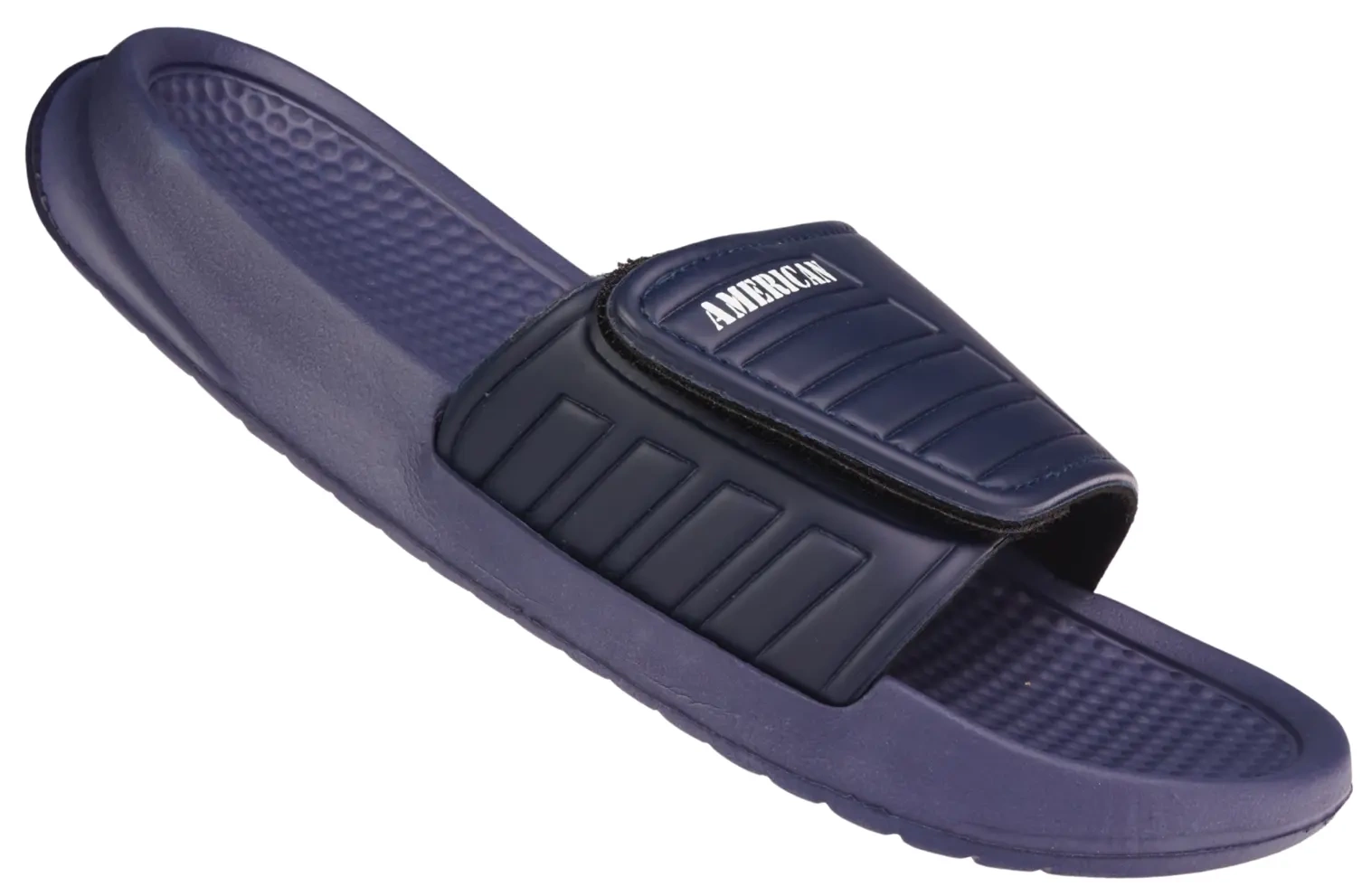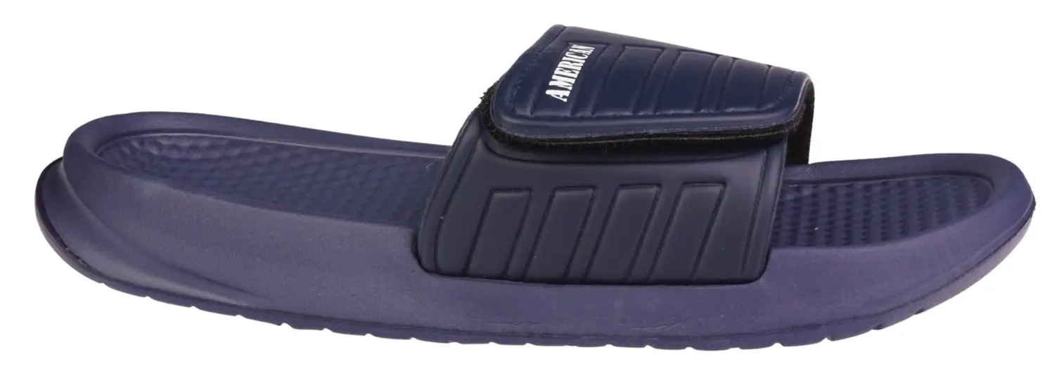 - Młodzieżowe klapki American Club w kolorze granatowym z nadrukiem na pasku i zapięciem na rzep. Lekkie, wygodne i antypoślizgowe. Idealne na basen, wakacje i do codziennego użytku. Dostępne w rozmiarach 37–41.