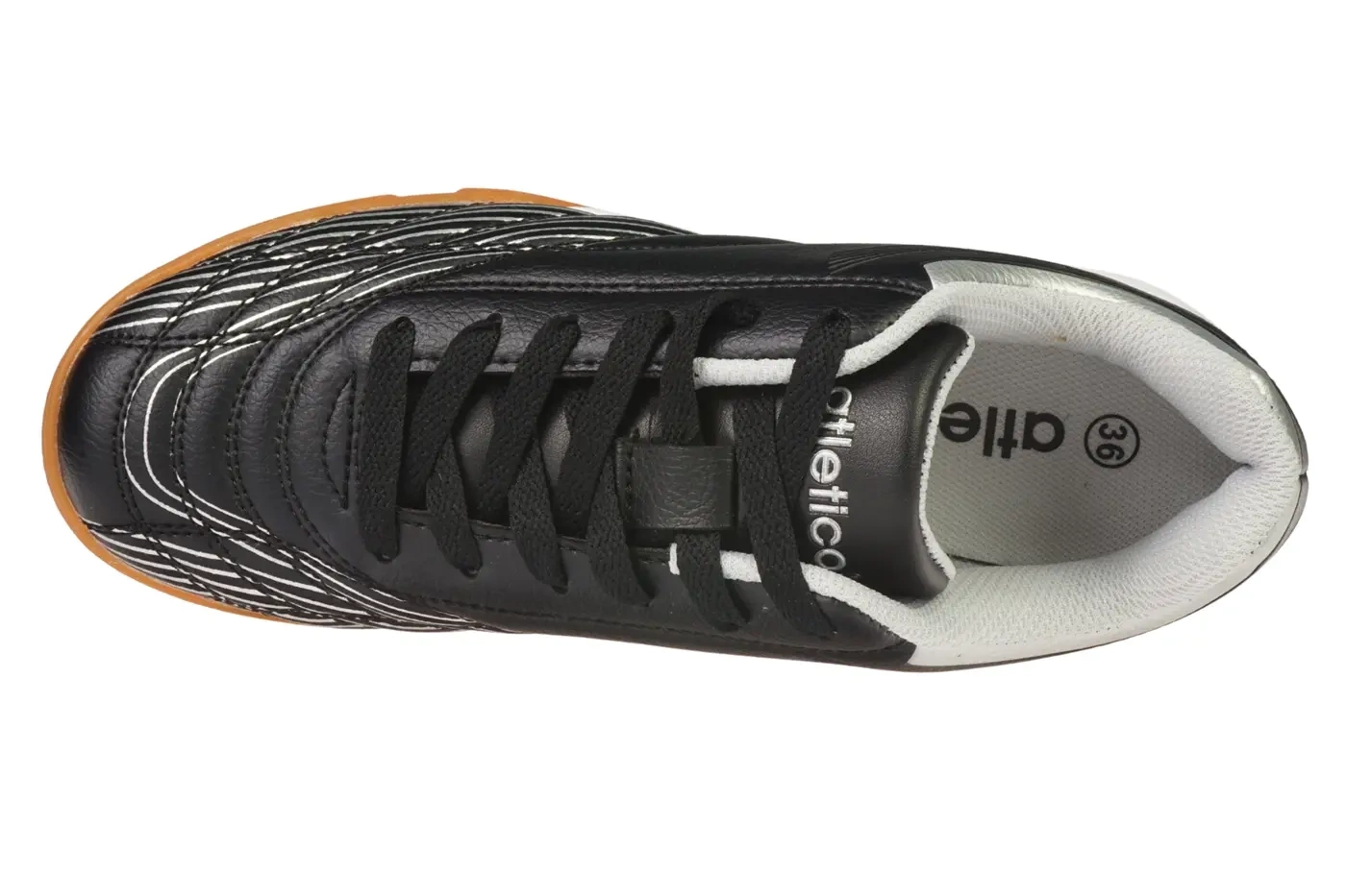 Męskie halówki Atletico w kolorze czarnym, z szarymi elementami. Wykonane z trwałej skóry ekologicznej, natomiast wewnątrz zastosowano wysokiej jakości, miękki materiał tekstylny. Wszystko to sprawia, że komfort użytkowania tego produktu jest na wysokim poziomie. Buty posiadają wzmocnione przody oraz usztywnioną piętę. Wkładki wykonane z tkaniny są miękkie i wygodne. Gumowe podeszwy zapobiegają ślizganiu się i zapewniają dobrą przyczepność do podłoża. Dużą zaletą halówek męskich są również sznurówki dzięki którym możesz pozwolić sobie na idealne dopasowanie do Twojej stopy. Prosty design i klasyczna kolorystyka została urozmaicona ciekawymi przeszyciami. Obuwie halowe sprawdzi się nie tylko podczas zajęć sportowych, ale również jest świetna propozycją do szkoły czy pracy.