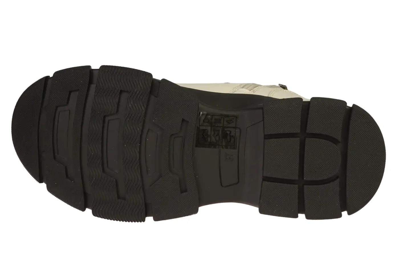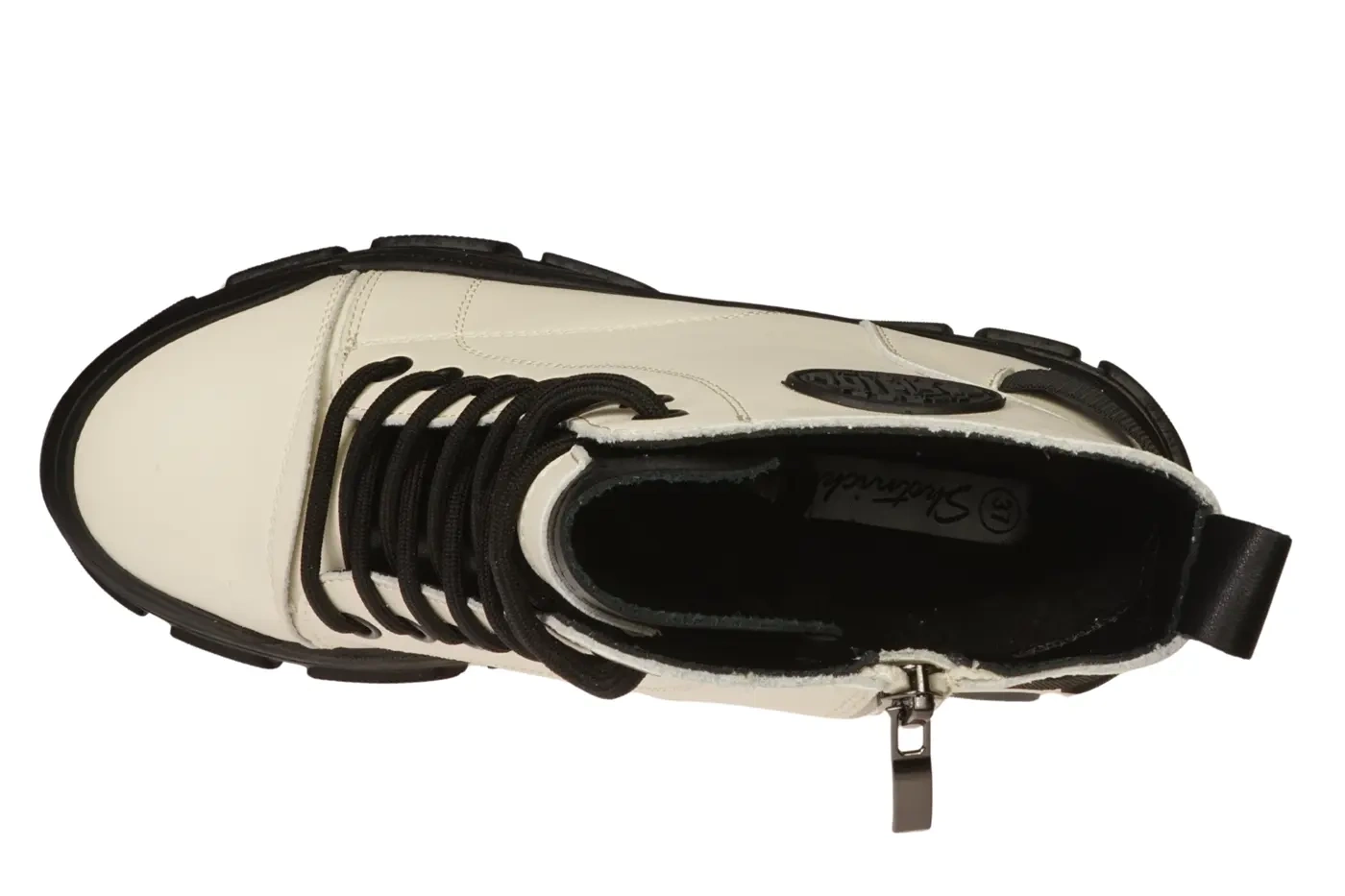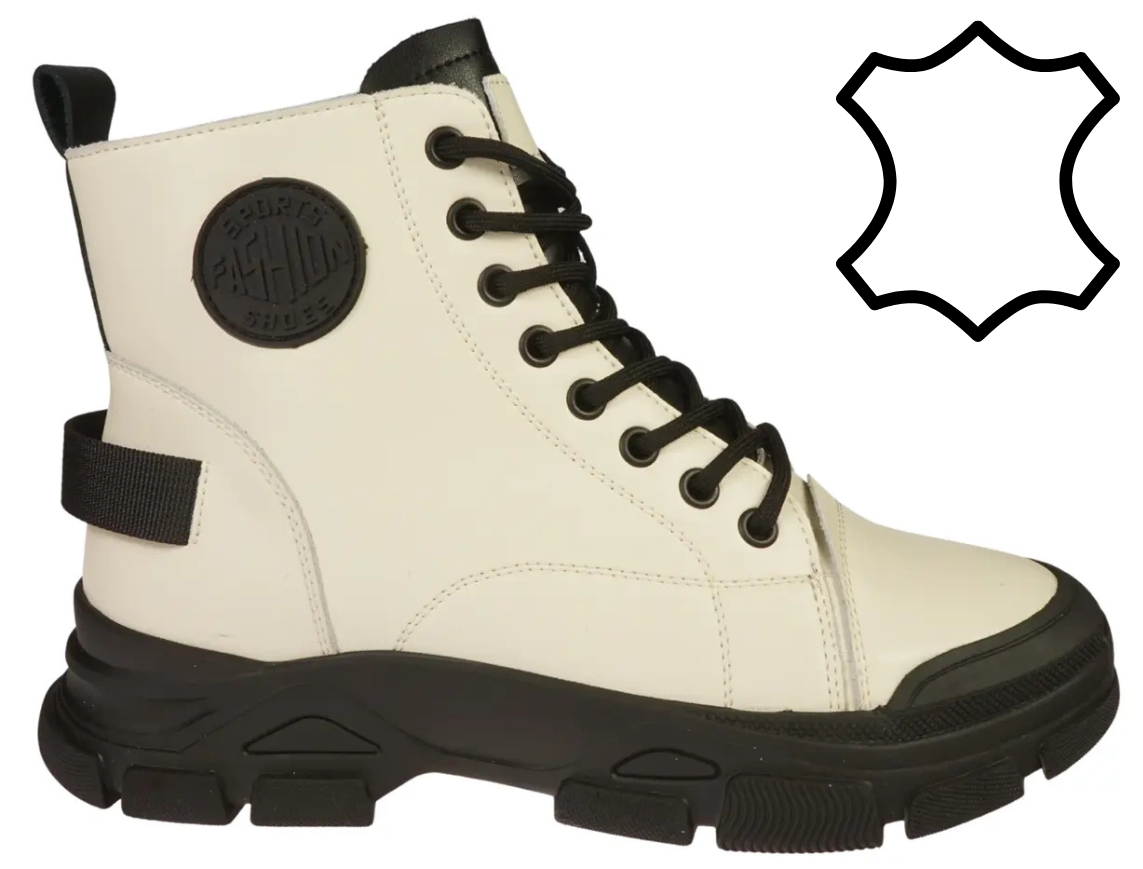 Przejściowe buty damskie Firmy Skotnicki w kolorze beżowym z czarnymi elementami. Wysokie obuwie jest solidne, ładnie się prezentuje oraz jest lekkie i wygodne. Buty damskie za kostkę zostały wykonane z wysokiej jakości materiałów - materiał wierzchu to skóra naturalna, a wewnątrz miękki polar. Połączenie to gwarantuje ochronę przed niskimi temperaturami oraz przed wiatrem jak również dba o komfort użytkowania. Obuwie typu glany posiada grubą gumową podeszwę z bieżnikiem, która zapewnia dobrą przyczepność do podłoża i zapobiega przed ślizganiem. Beżowe buty damskie są wiązane i na boku posiadają zamek błyskawiczny dzięki czemu doskonale dopasują się do stopy. Podsumowując, wysokie obuwie zimowe w idealny sposób sprawdzi się w jesienne oraz zimowe dni do codziennego użytku. Kolorystyka w jakiej zostały wykonane sprawia że są one praktyczne i pasują do wielu stylizacji. Damskie botki ze względu na użyte materiały są dosyć proste w pielęgnacji oraz utrzymaniu czystości.