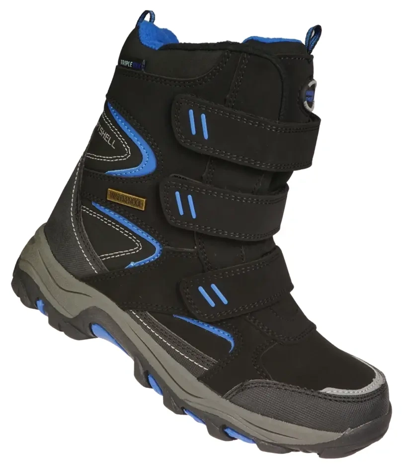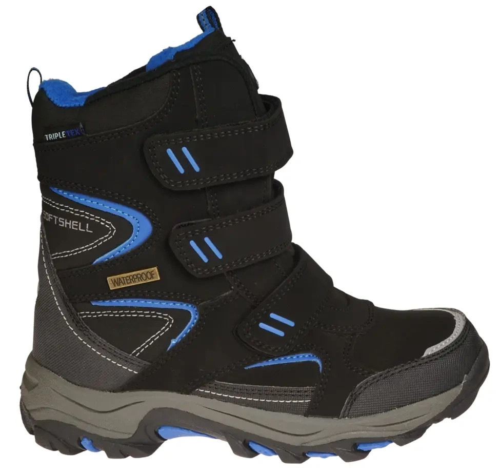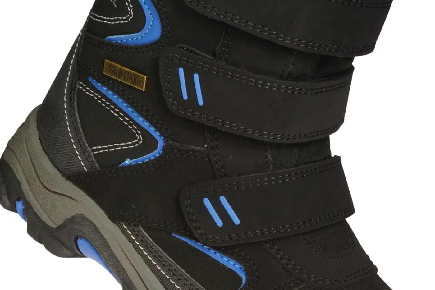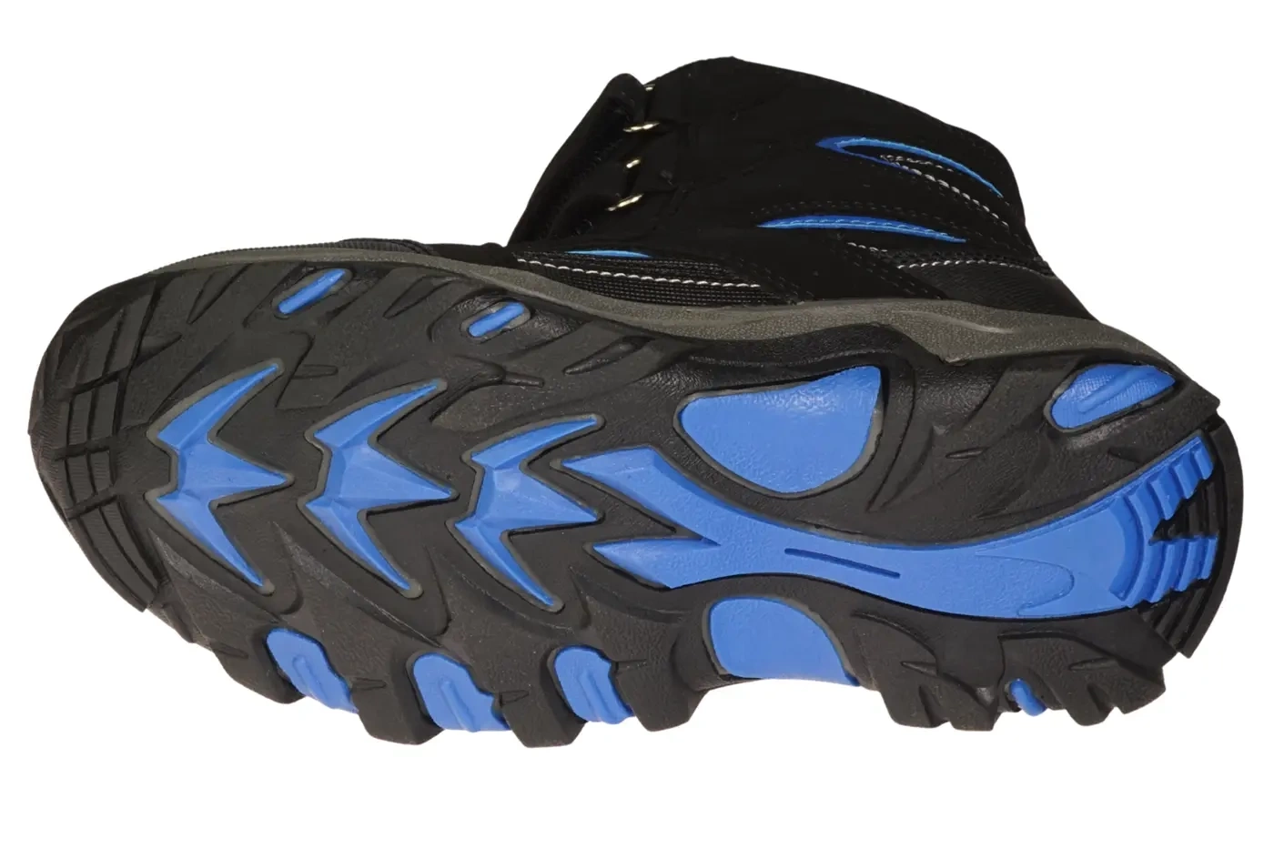 Zimowe śniegowce firmy American Club w kolorze czarnym z niebieskimi przeszyciami, matowym wykończeniem oraz szarymi wstawkami, które dodają charakteru. Solidnie i starannie wykonane z wysokiej jakości materiału typu softshell. Gruba podeszwa z bieżnikiem zapewnia dobrą przyczepność do podłoża oraz komfort użytkowania. Wnętrze buta zostało ocieplone polarem, co gwarantuje odpowiednią temperaturę nawet w mroźne dni. Buty zapinane są na rzep, co ułatwia i przyspiesza zakładanie. Dodatkowo posiadają wzmocnioną piętę oraz przód. Podsumowując, zimowe śniegowce firmy American Club doskonale sprawdzą się w jesienne i zimowe dni – zarówno do codziennego użytku, jak i podczas górskich wypraw. Zapewniają ciepło, ochronę przed śniegiem i deszczem. To idealny wybór dla Twojej pociechy.