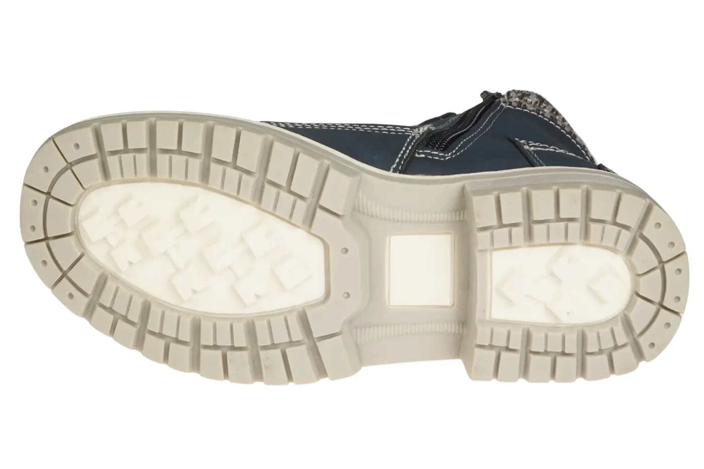Zimowe trzewiki dziecięce firmy American Club w kolorze granatowym. Wysoka cholewka sprawia, że buty są wygodne i dobrze prezentują się na nodze. Wykonane na wzór glanów, z grubą, masywną podeszwą, która dodaje charakteru prostej formie. Buty wykonano z wysokiej jakości materiałów – cholewka ze skóry ekologicznej zapewnia ochronę przed niską temperaturą i ułatwia utrzymanie czystości. Gruba podeszwa z bieżnikiem gwarantuje dobrą przyczepność do podłoża i komfort użytkowania. Wnętrze butów zostało ocieplone kożuchem, co zapewnia ciepło nawet w mroźne dni. Trzewiki są wiązane, ale dodatkowym atutem jest boczny suwak, który przyspiesza zakładanie i umożliwia lepsze dopasowanie do stopy. Dzięki klasycznej granatowej kolorystyce, prostemu designowi i solidnemu wykonaniu, to idealne buty zimowe dla dziecka – świetne do codziennego użytku, a także bardziej eleganckich stylizacji.
