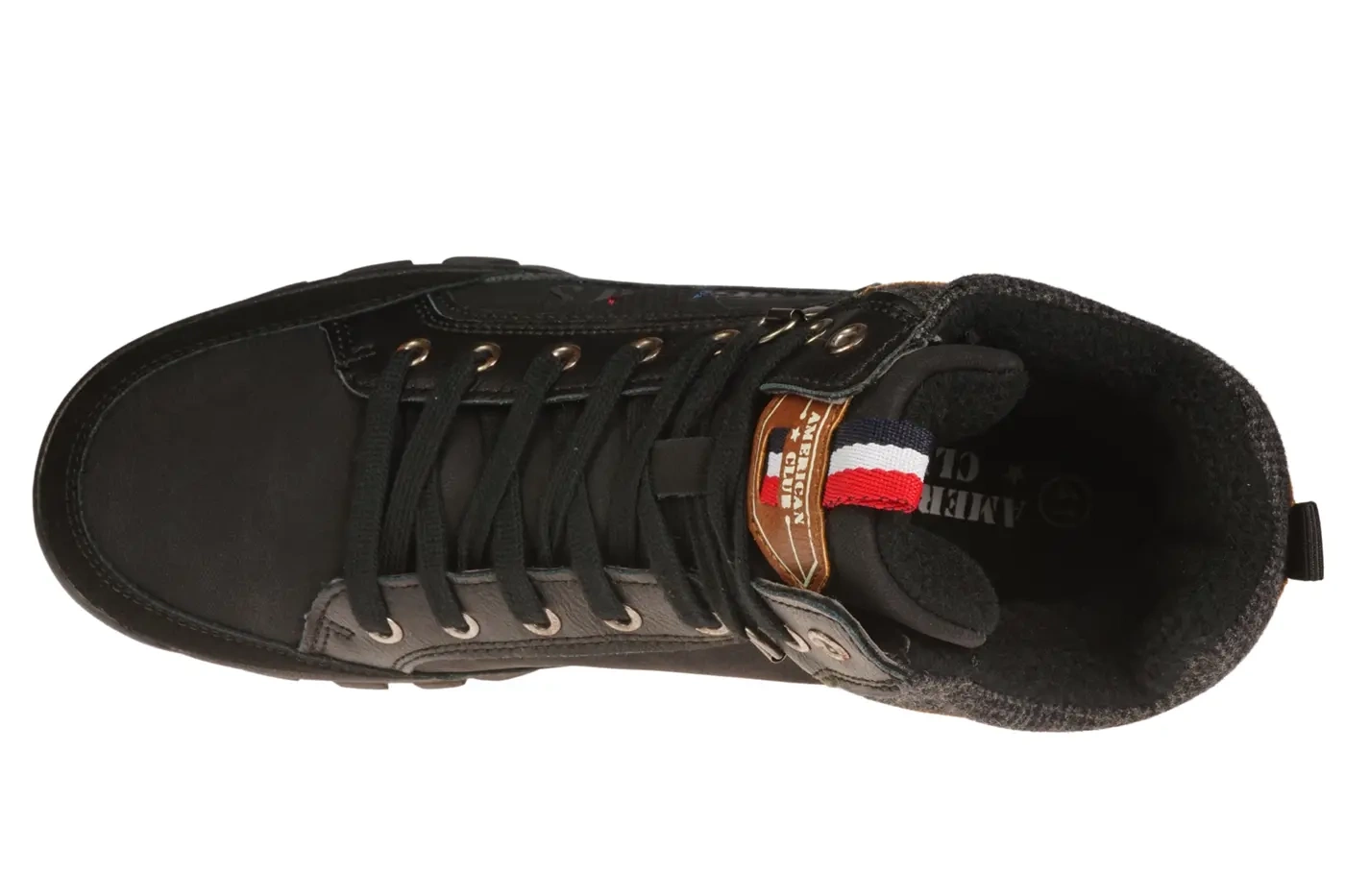 - Męskie buty przejściowe American Club w czarnym kolorze to trwałe i wygodne obuwie z tworzywa, z tekstylnym wnętrzem i wkładką. Gruba gumowa podeszwa z bieżnikiem zapewnia stabilność, a sznurowanie umożliwia idealne dopasowanie.