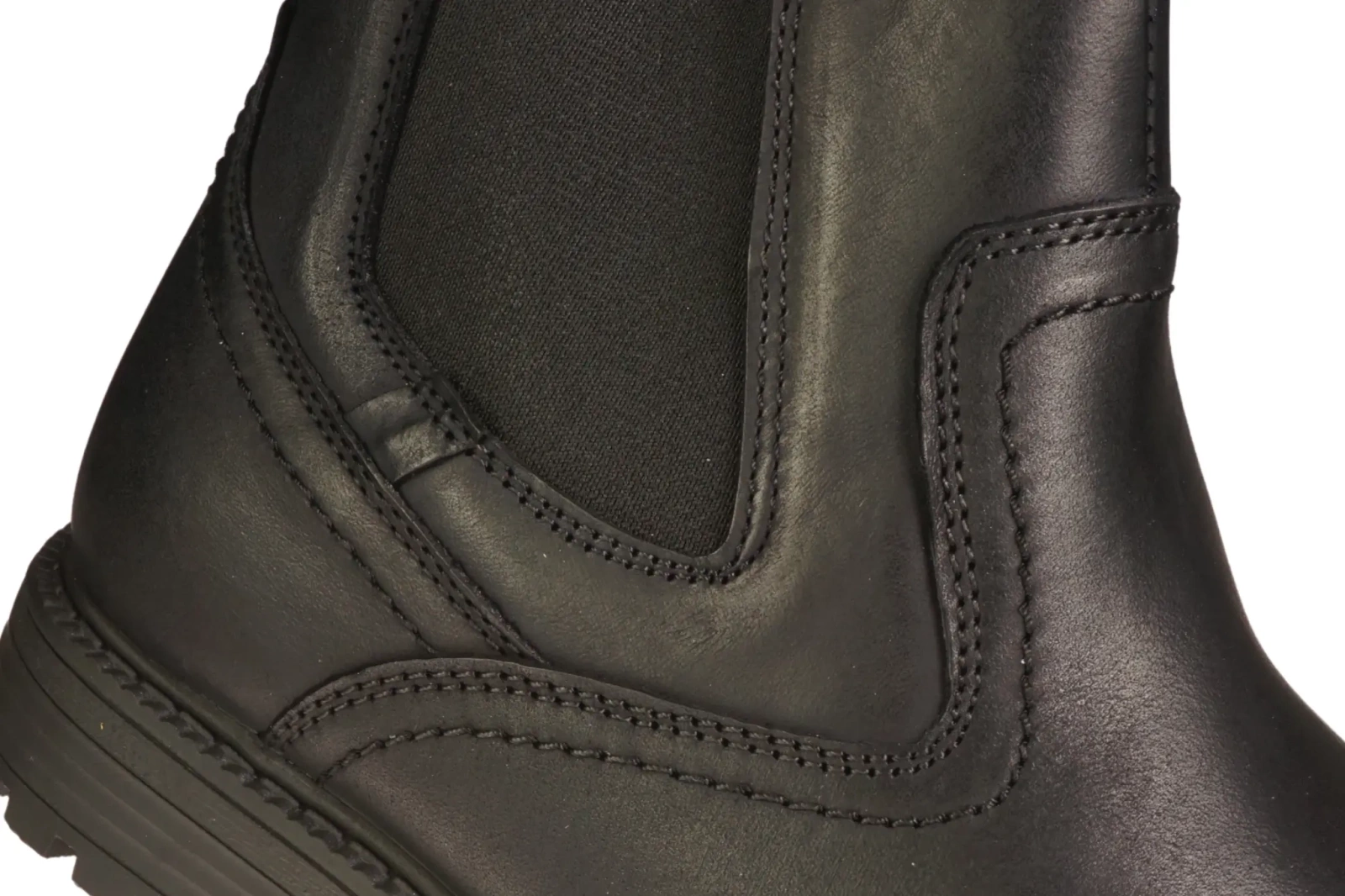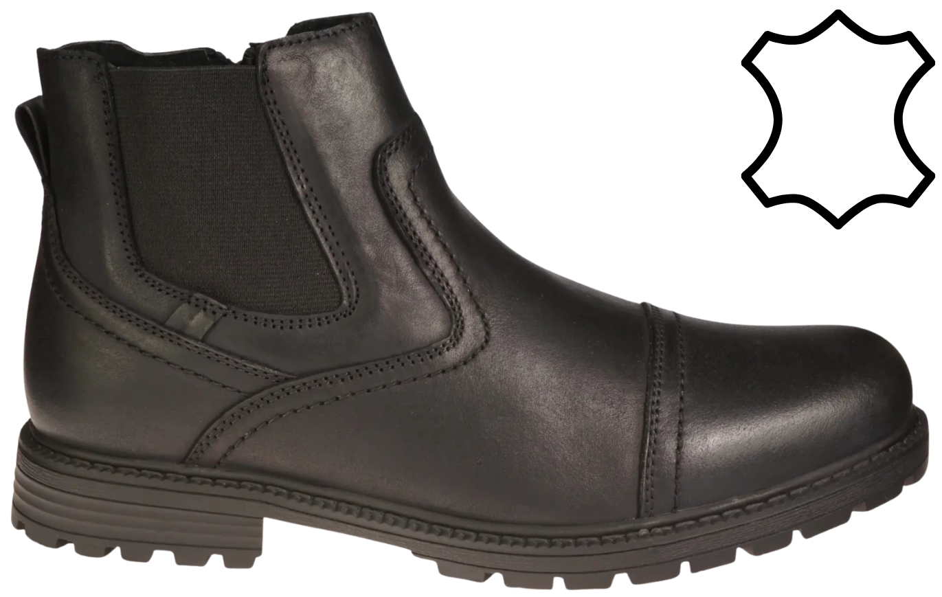 Zimowe buty męskie Firmy American Club w kolorze czarnym. Eleganckie skórzane obuwie posiada ozdobne przeszycia, które dodają charakteru klasycznej kolorystyce. Ciemna skóra naturalna z zewnątrz chroni przed zabrudzeniami, wchłanianiem się wody i wiatrem, a ocieplany polar wewnątrz gwarantuje ciepło i wygodę. Buty posiadają usztywnioną piętę, od strony zewnętrznej mają gumę ściągającą a wewnątrz zamek błyskawiczny. Zimowe buty męskie za kostkę posiadają podeszwę wykonaną z lekkiego materiału PVC która jest osadzona na lekkim obcasie 2,5 cm który urozmaica konstrukcję. Klasyczna kolorystyka męskich eleganckich butów zimowych w połączniu z mocnym męskim designem i praktyczną konstrukcją sprawiają, że obuwie sprawdzi się w jesienne i zimowe dni do codziennego użytku czy pracy. Skórzane obuwie zimowe American Club to wysoka jakość i solidne wykonie, przy odpowiedniej pielęgnacji buty wytrzymają wiele sezonów.