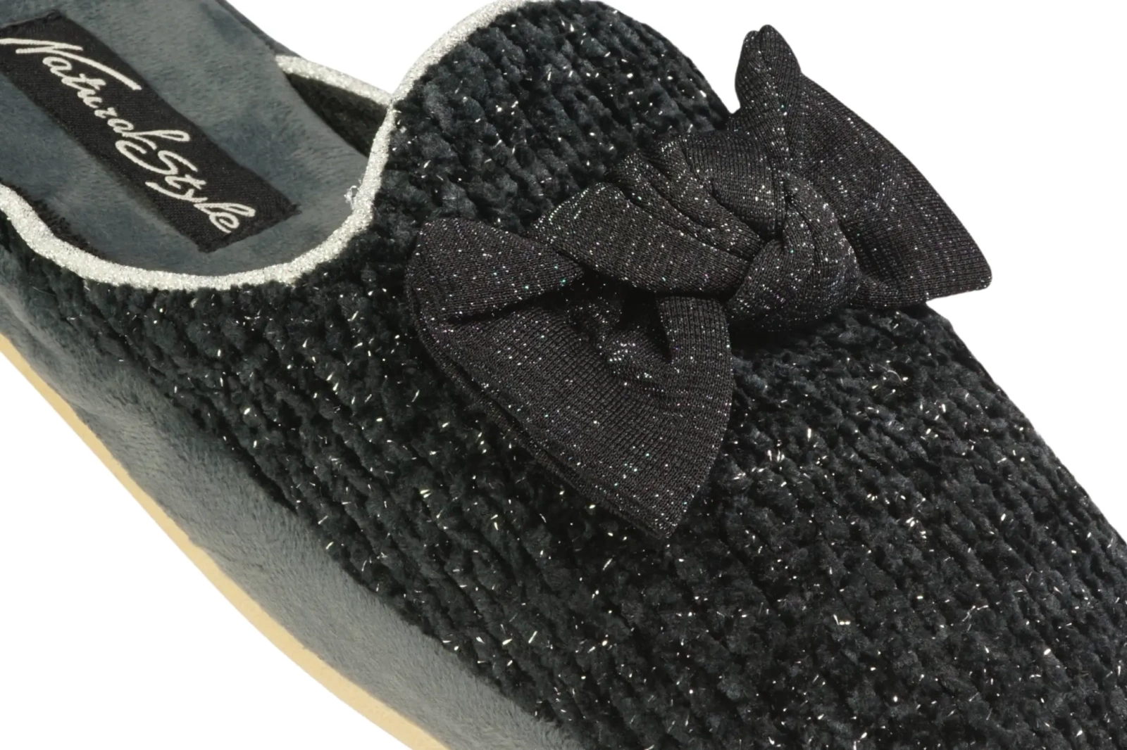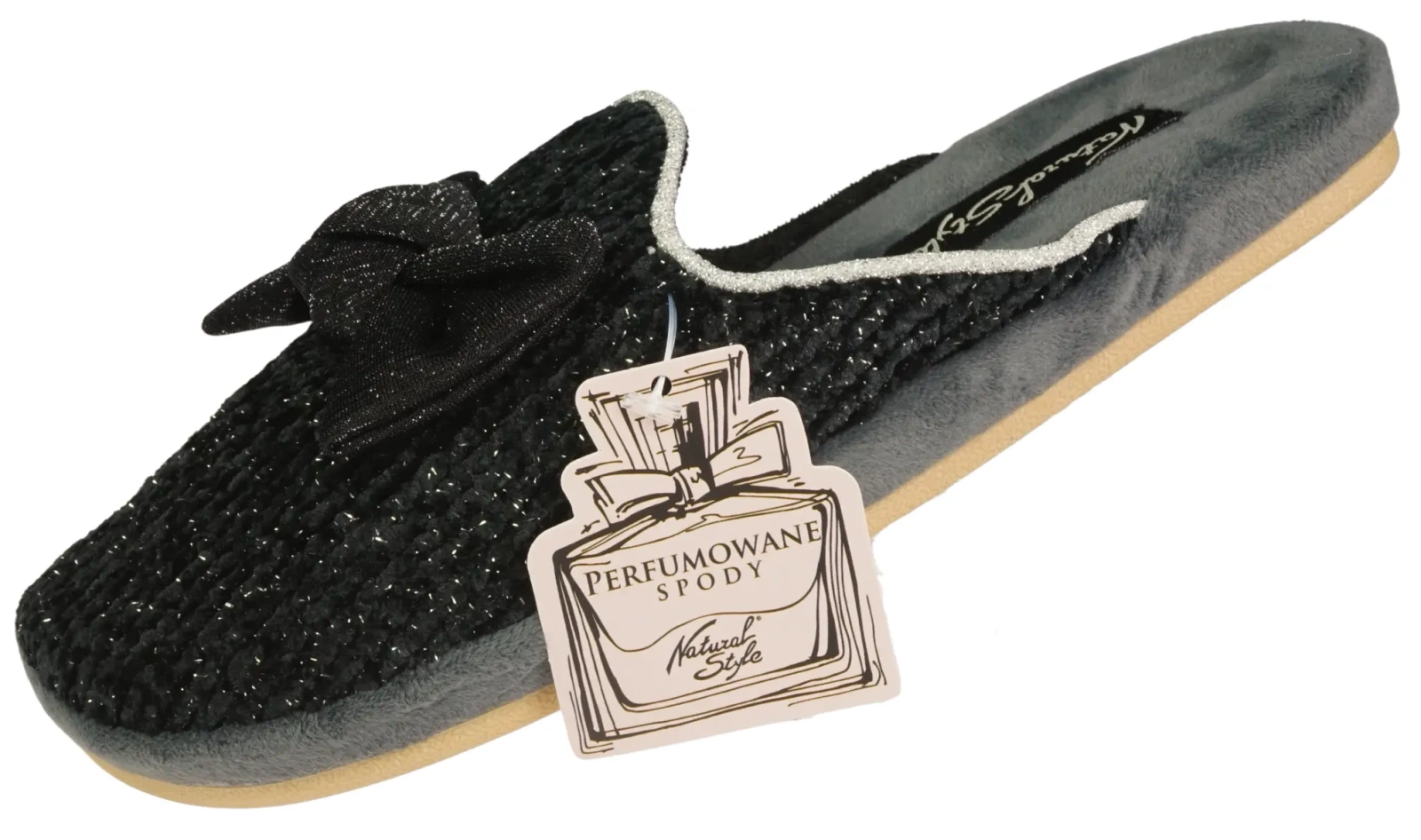 Damskie pantofle tekstylne firmy Meteor w czarnym kolorze z ozdobną kokardą na przodzie. Kapcie damskie wykonane zostały z miękkiego tekstylnego materiału. Wewnątrz obuwie zostało wykończone materiałem, który dba o ciepło i dodaje zimowego charakteru. Pantofle posiadają miękką podeszwę z PVC, która dba o wygodę i komfort użytkowanie oraz tworzy produkt lekkim. Zamknięte przody i materiał z jakiego zostały wykonane gwarantują ciepło oraz wygodę. Kapcie damskie w klasycznym stylu są idealnym pomysłem na prezent. Wybierz je dla siebie lub dla swoich bliskich! Sprawdzą się idealnie w chłodne dni jako obuwie domowe. To praktyczne i modne obuwie domowe, łączące wygodę z nowoczesną estetyką – idealne na sezon jesienno-zimowy.