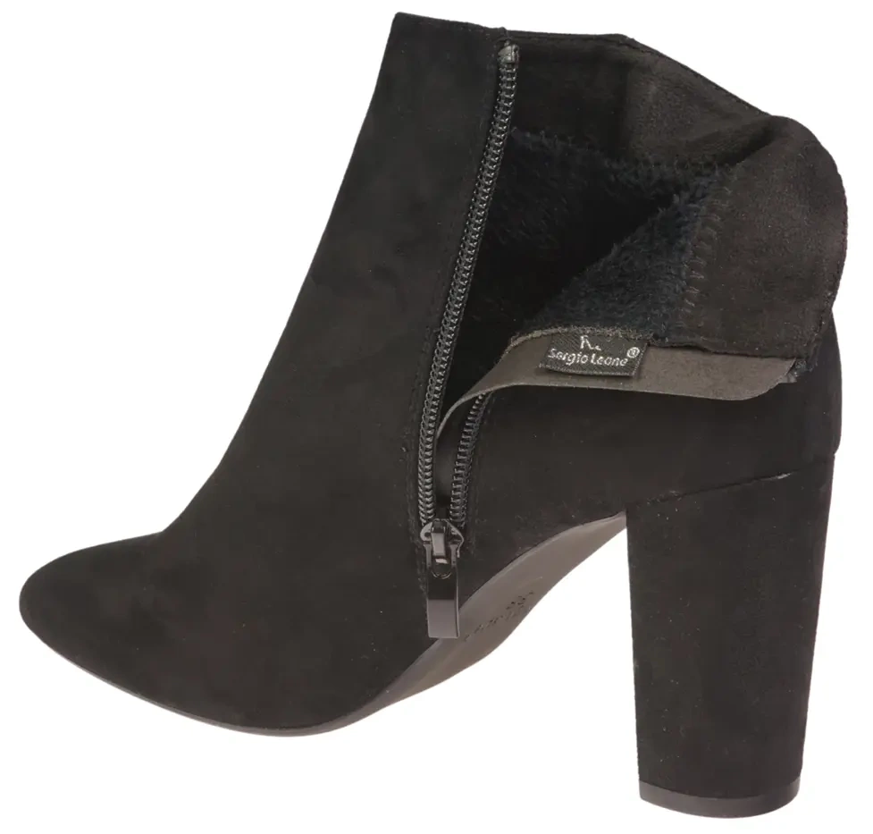 - Damskie zimowe botki Sergio Leone z zamszowej eko-skóry w czarnym kolorze. Ocieplane polarem, na stabilnym klockowym obcasie. Zamek ułatwia zakładanie. Stylowe i wygodne buty idealne na chłodne dni i różne stylizacje.