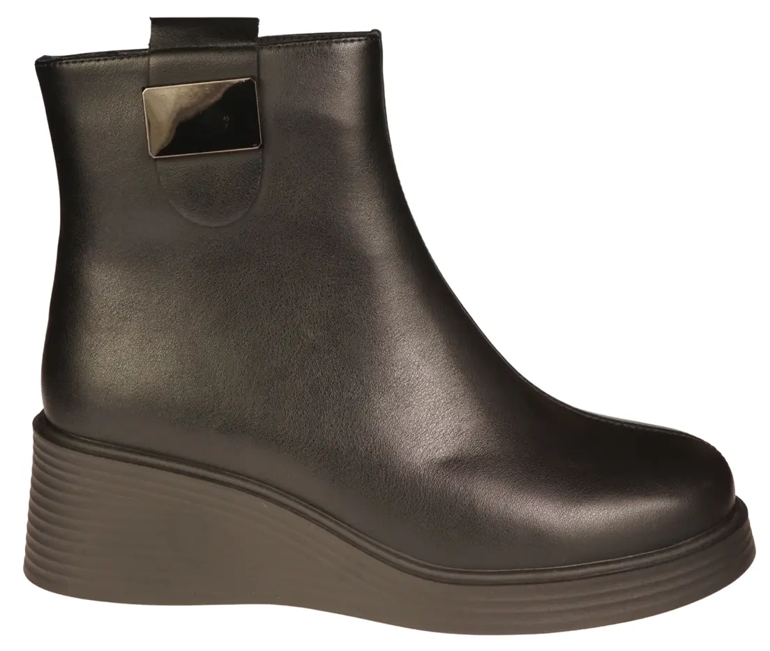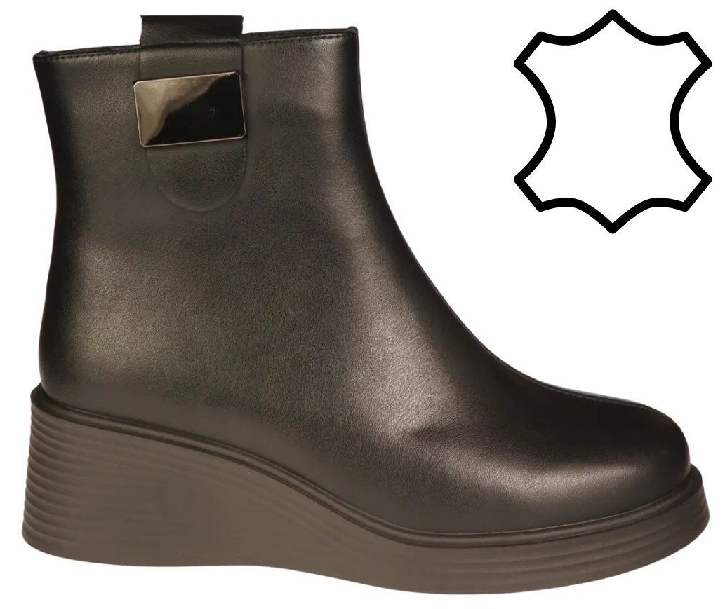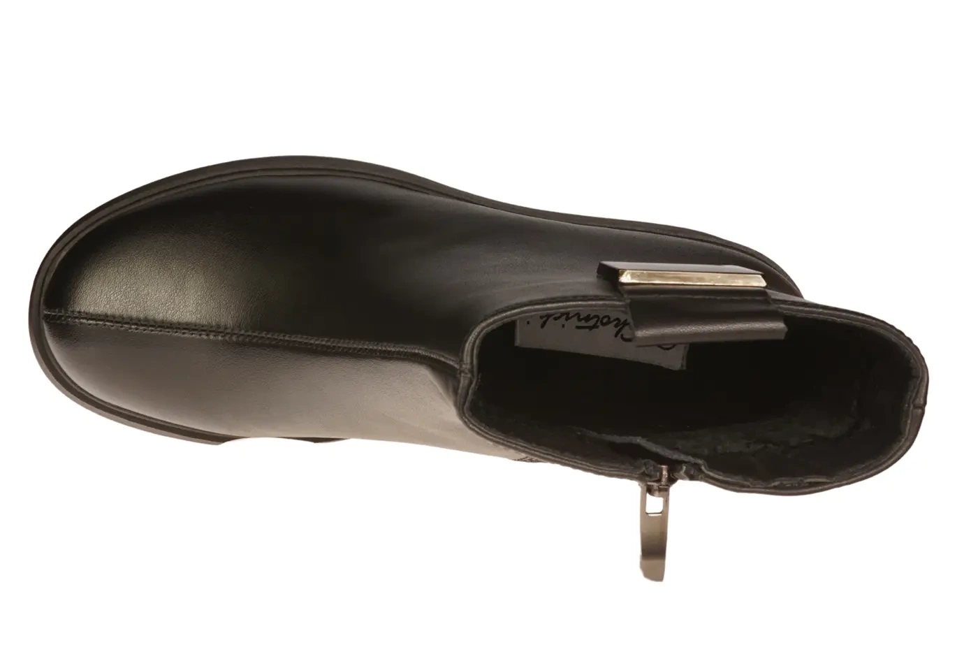 Zimowe buty damskie firmy Skotnicki w klasycznym czarnym kolorze na platformie 4,5 cm. Obuwie damskie wykonano ze skóry naturalnej wysokiego gatunku precyzyjnie i starannie. Są idealnym wyborem na chłodniejsze dni, ponieważ są delikatnie ocieplone polarem, który zapewnia ciepło. Dzięki solidnemu obcasowi w formie platformy, te botki zimowe gwarantują nie tylko stabilność, ale także komfort noszenia przez cały dzień, bez względu na intensywność Twoich codziennych zajęć. Zamek umieszczony od wewnętrznej strony usprawnia zakładanie i ściąganie, a klasyczny, okrągły czubek optycznie wysmukla nogi i stanowi ponadczasowe rozwiązanie.