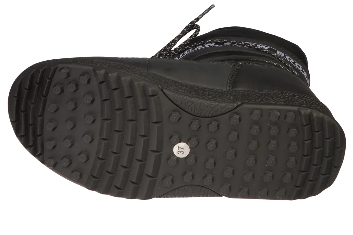 Zimowe buty damskie Firmy American Club w kolorze czarnym ze ściągaczem. Obuwie za kostkę jest wygodne i komfortowe, a ich prosty design idealnie wpasuje się w obecne trendy. Stworzone z modnego i praktycznego ortalionu pozwala w łatwy sposób unikać zabrudzeń oraz zabezpiecza przed wiatrem i deszczem. Śniegowce damskie posiadają wodoodporną membranę Tripletex, która w zaawansowany sposób odprowadza wilgoć. Wysokie ortalionowe buty posiadają grubą podeszwę z bieżnikiem, która dba o dobrą przyczepność do podłoża oraz zapobiega przed ślizganiem. Wnętrze obuwia zimowego jest ocieplane miękkim polarem co zapewni odpowiednią temperaturę nawet podczas zimowych dni. Rzep usprawnia proces zakładania i zdejmowania obuwia natomiast ściągacz pomaga w dobrym dopasowaniu buta do stopy oraz jest elementem ozdobnym. Czarne buty zimowe są praktyczne i łatwe w utrzymaniu czystości, a wysoka jakość materiałów gwarantuje komfort i wytrzymałość. Idealne damskie obuwie ocieplane na zimowe lub jesień do codziennego użytku czy też w górskie wyprawy.