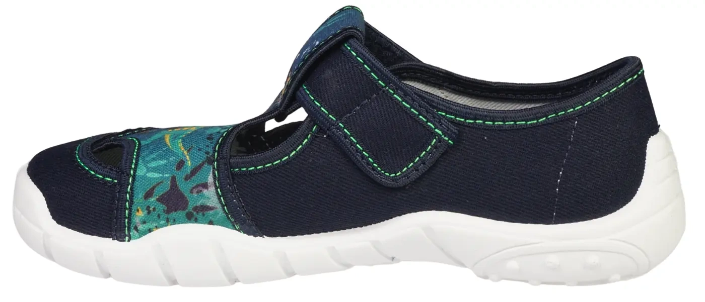 Tenisówki dziecięce Viggami w granatowym kolorze z ciekawą grafiką. Posiadają elastyczną antypoślizgową podeszwę która jest wentylowana od spodu, zapewnia ona wygodę, i bezpieczeństwo naszych pociech. Kapcie są zapinanie na rzep co znacznie ułatwia samodzielne zakładanie obuwia przez dziecko oraz zapewnia idealne dopasowanie się do stopy. Buciki sprawdzą się do przedszkola jak i harcowania po domu. Produkt jest stworzony w Polsce przez firmę Viggami. Kapcie są lekkie wygodne i mają półotwarte noski co jeszcze bardziej poprawia wentylację, dodatkowo posiadają certyfikat zdrowej stopy który zapewnia , że obuwie wykonane jest prawidłowo pod względem konstrukcyjnym, technologicznym i materiałowym oraz prezentuje się estetycznie. Dzięki niemu Rodzice mają pewność, że stópki ich dzieci są bezpieczne i właściwie się rozwijają.