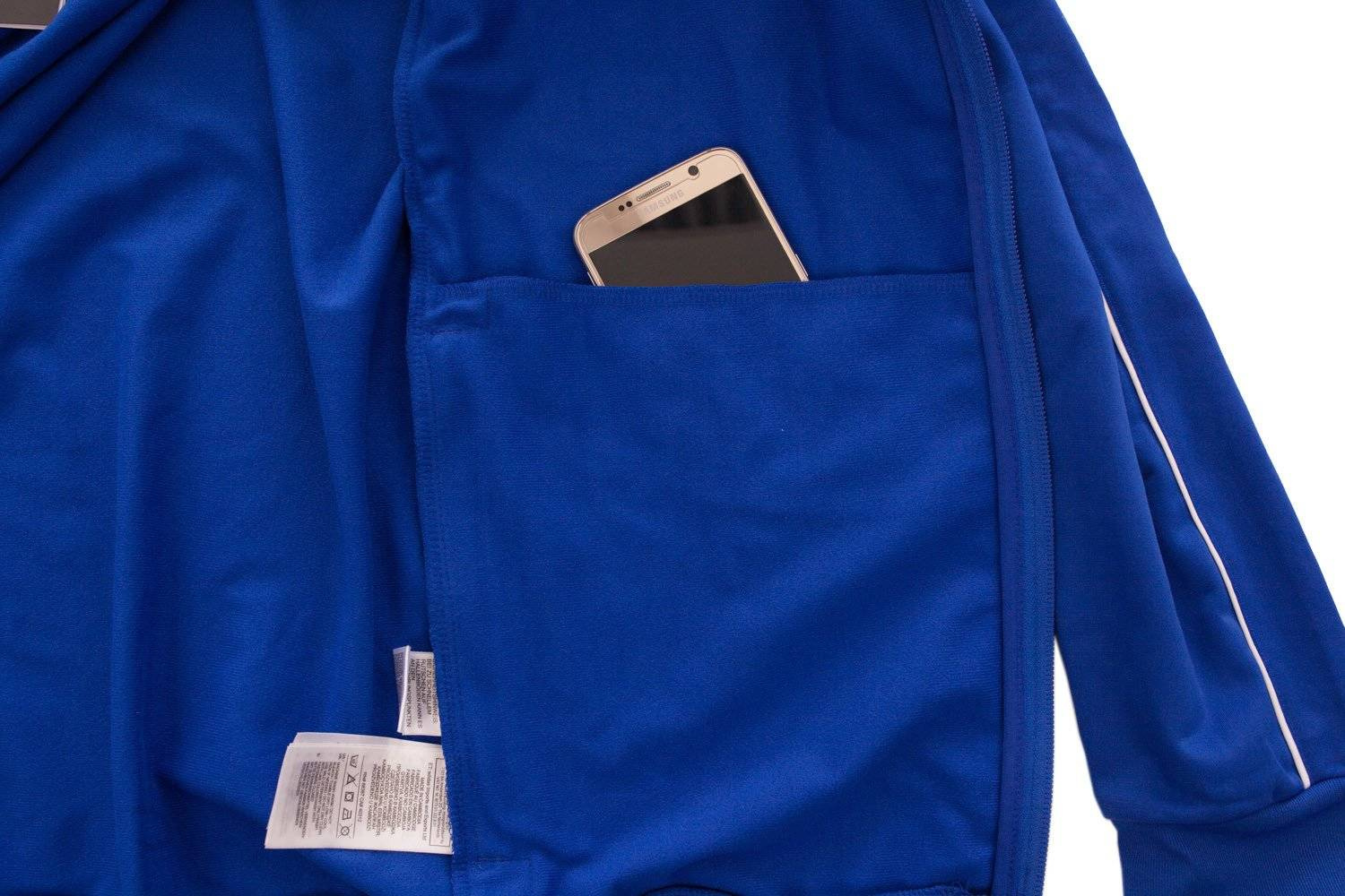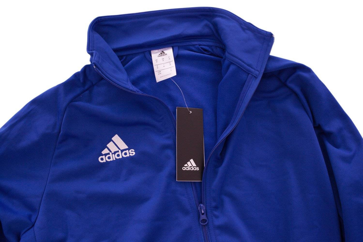 Bluza dziecięca firmy Adidas z serii Core 18 stworzona z myślą o małych sportowcach. Nadaje się jednak nie tylko na treningi czy podczas biegania, ale jako element codziennego stroju. Wykonana została z wysokiej jakości poliestru 100%, posiada naszyte logo firmy umiejscowione na prawej piersi. Model w kolorze niebieskim ma wstawkę w postaci białego paska ciągnącego się od kołnierza, aż po koniec rękawów wyposażonych w ściągacze. Bluza Adidas na całej długości zasuwana jest na zamek błyskawiczny. Posiada 4 kieszenie: 2 zewnętrzne (z zamkiem) i 2 wewnętrzne, w których można schować wiele drobnych rzeczy. Bluza jest nowa, posiada oryginalne metki.