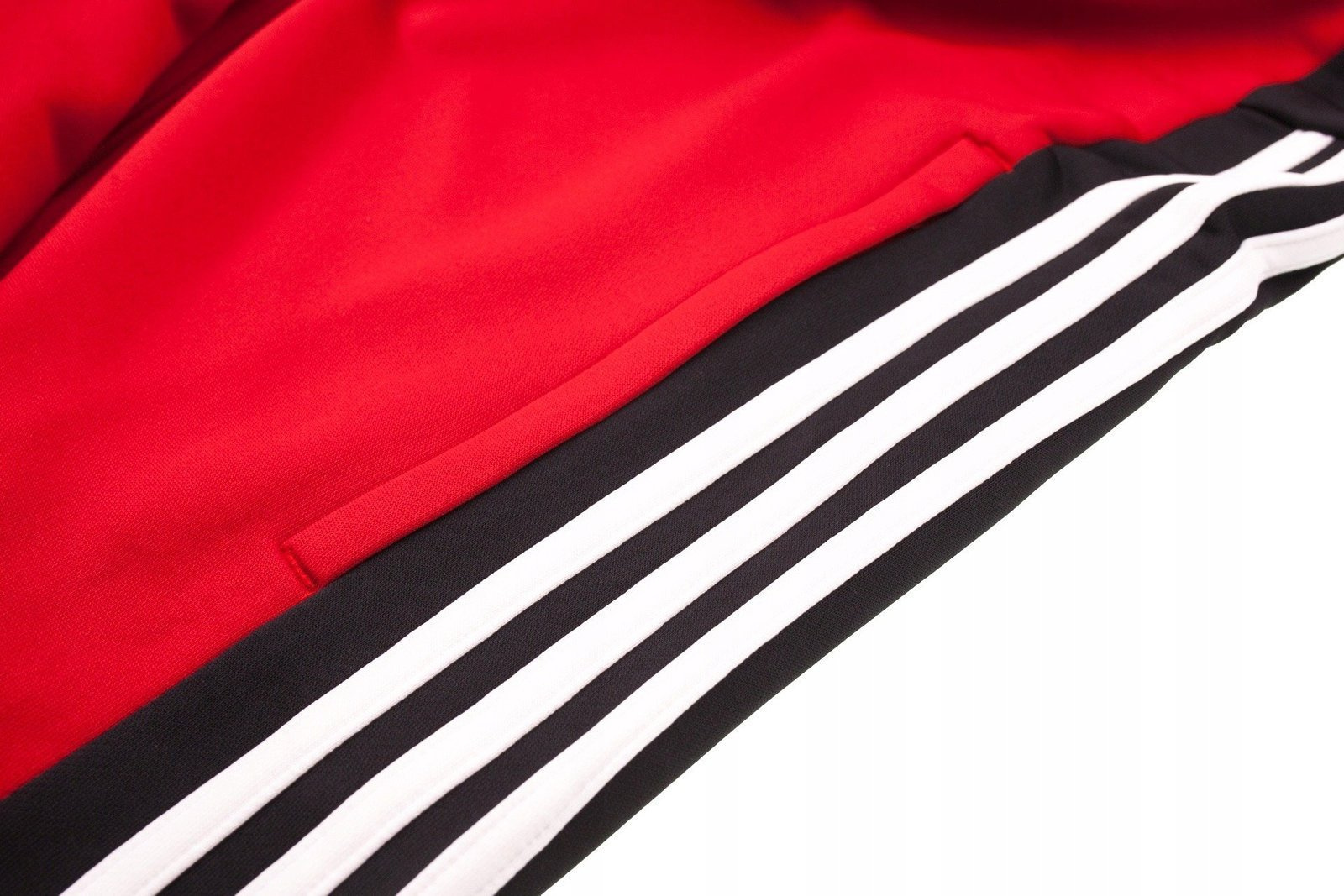 Juniorska bluza zapinana na zamek marki Adidas, w kolorze czerwonym. Bluza pochodzi z serii Regista i została wykonana w 100% z poliestru. Nie mogło zabraknąć w tym modelu charakterystycznych pasków, które kojarzone są na całym świecie z marką Adidas. W bluzie postawiono na funkcjonalność, dzięki czemu są dwie kieszenie na zamek, wygodny zamek błyskawiczny i ściągacze na rękawach. Projekt ten został uszlachetniony wstawkami materiałowymi w kontrastującym kolorze, a logotyp marki został wyszyty po prawej stronie. Ten model bluzy adidas spodoba się niemal każdemu fanowi zarówno sportowej mody na co dzień, jak i treningów. Projekt został stworzony z myślą zarówno o codziennym użytkowaniu jak i aktywności fizycznej. Bluza doskonale sprawdzi się do klasycznych dżinsów lub innych spodni materiałowych, ale także do sportowych szortów! Dzięki funkcjonalności tego produktu, można mieć pewność, że zakup na pewno będzie udany, a sama bluza z racji wysokiej jakości wykonania, posłuży nam przez wiele sezonów. Każdy młody trendsetter na pewno doceni też fakt, że bluza jest ponad panujące trendy i zawsze wygląda modnie! Produkt jest nowy i posiada oryginalne metki.