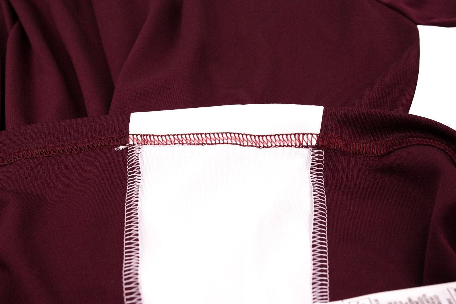 - T-shirt męski marki Adidas w kolorze bordowym. T-shirt posiada naszyte ozdobne trzy paski oraz materiałową wstawkę w kontrastującym kolorze po bokach. Projekt został wykonany w 100% z poliestru.