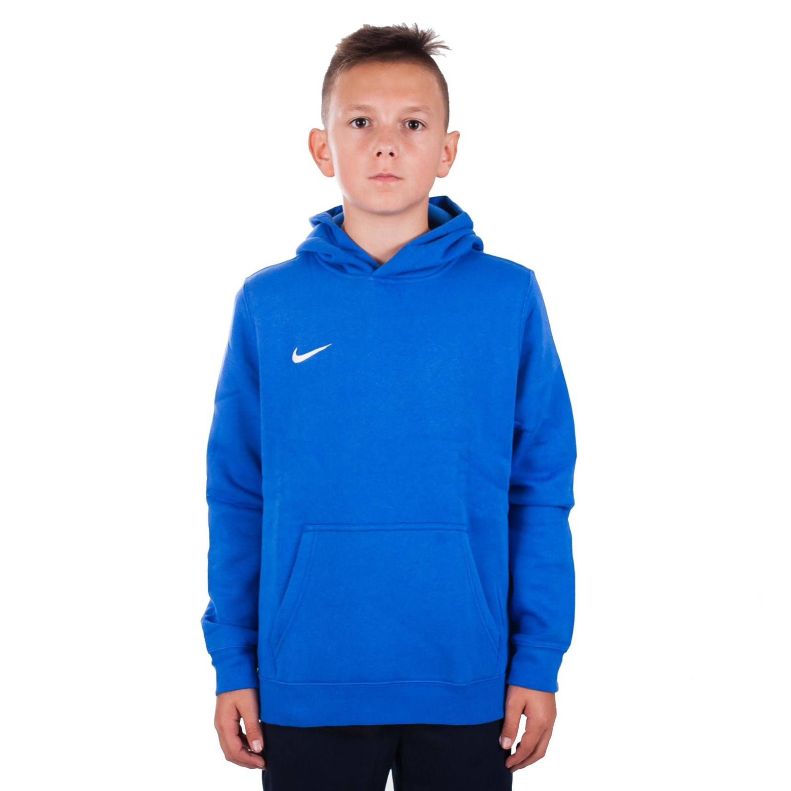 Bluza dresowa dla juniora marki Nike, z kapturem, w kolorze niebieskim. Bluza posiada kontrastujący, wszyty logotyp w kolorze białym oraz kieszeń z przodu typu „kangurek”. Bluza pochodzi z serii PO FLC TM Club 19. Bluza wykonana jest z 80% bawełny oraz 20% poliesteru. Tego typu bluza jest uwielbiana od wielu już lat zarówno przez tych młodszych jak i starszych. Klasyczny krój, kolor oraz wykonanie bluzy sprawiają, że bez względu na trendy, zawsze będzie fajnie i stylowo wyglądała. Bluza jest idealna do codziennego noszenia – do szkoły, na spacer, rower z kolegami czy popołudnie spędzone w domu. Bez względu na to, co dobierze się do tej bluzy można mieć pewność, że efekt końcowy będzie dobry! Dla tych, którzy lubią całe zestawy ubrań, doskonałym wyborem będą spodnie dresowe z tej samej serii, które z bluzą stworzą duet idealny. Dla młodego fana mody oraz dobrego wyglądu takie zestaw na pewno przypadnie do gustu!