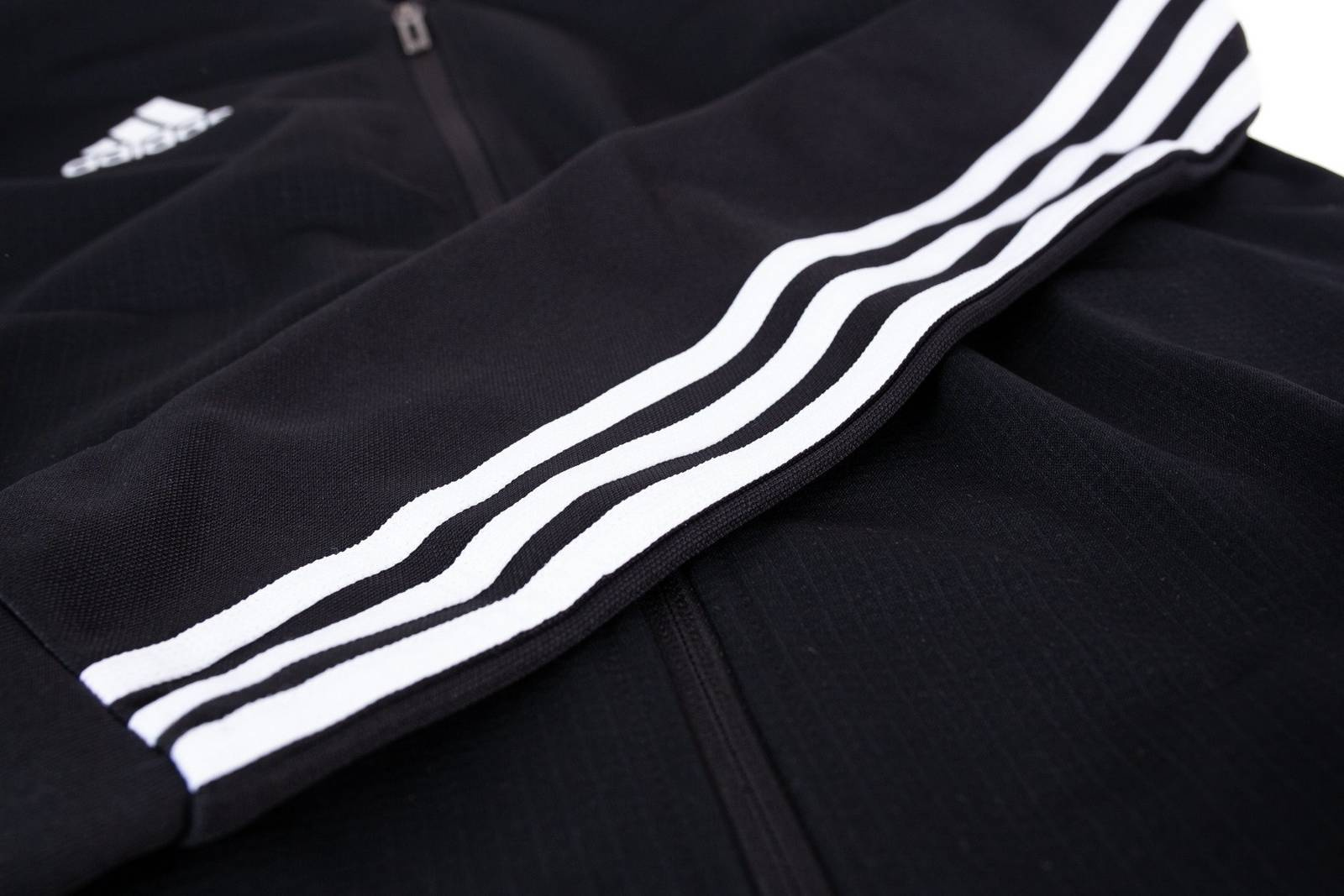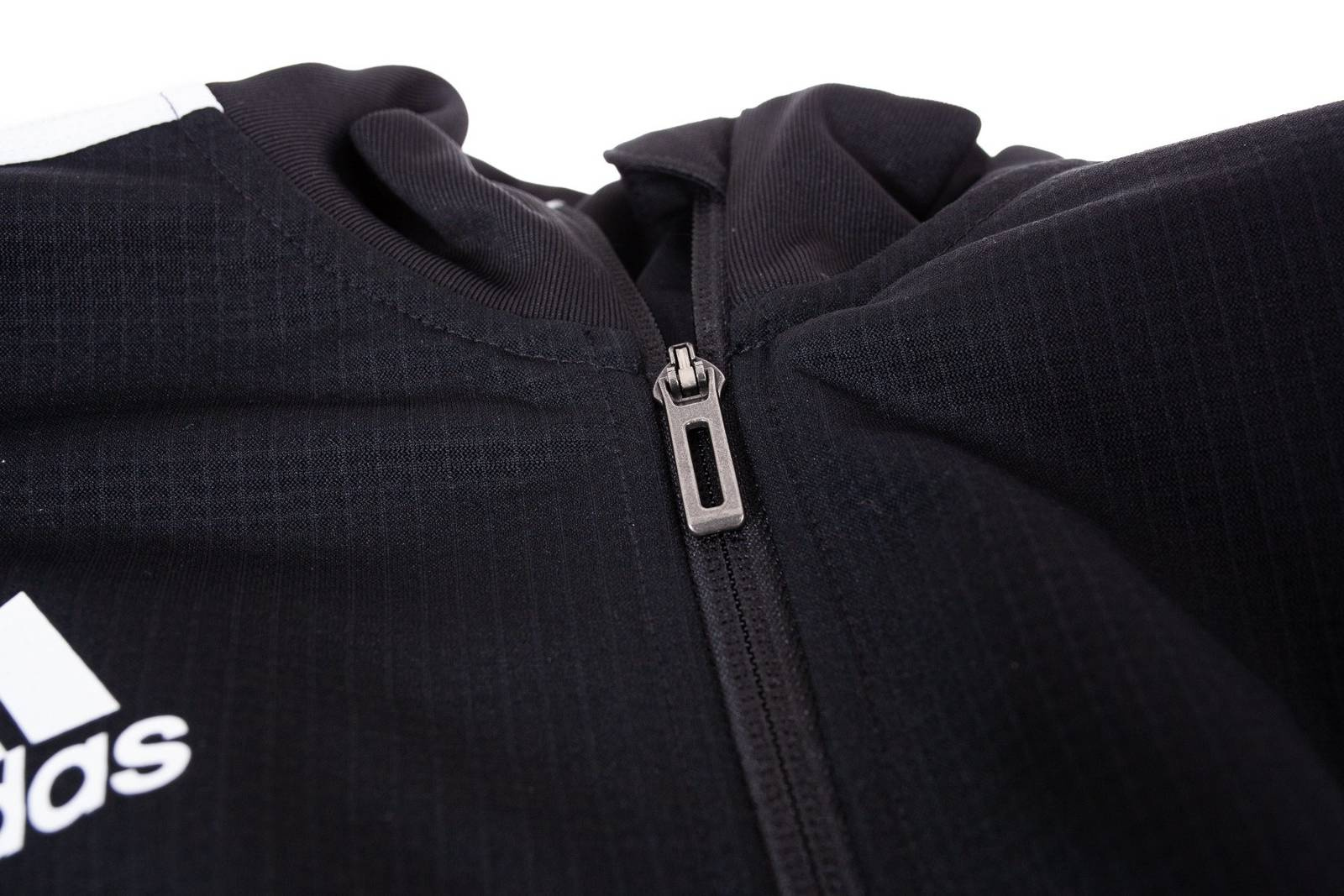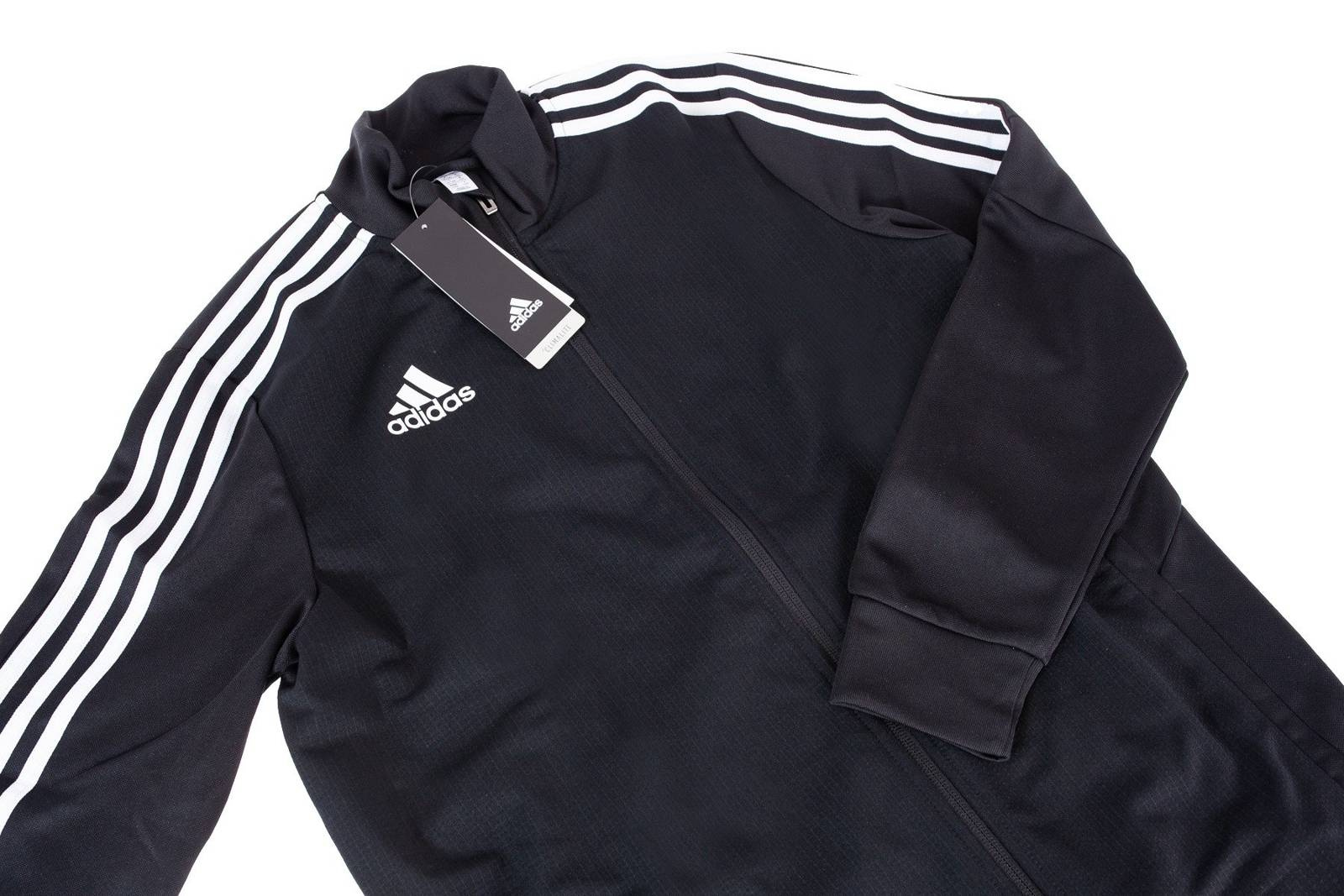 Dziecięca bluza firmy Adidas z kolekcji Tiro 19 Training sprawdzi się idealnie dla aktywnych fizycznie juniorów, którzy cenią sobie wygodę i komfort nie tylko na treningach, ale też na co dzień. Bluza Adidas tiro 19 w kolorze czarnym wykonana została w 100% z najwyższej jakości poliestru zgodnie z technologią ClimaLite, która zabezpieczy ciało przed przegrzaniem w wysokich temperaturach i odprowadzi pot na zewnątrz materiału. Model zapewnia maksymalną swobodę ruchów. Logo firmy umieszczone zostało na prawej piersi. Bluza zaopatrzona jest w kieszenie zasuwane na zamek, umożliwiające przechowywanie najpotrzebniejszych drobiazgów przy sobie. Bluza posiada wstawki w postaci elastycznych paneli na łokciach i na bokach oraz białych, charakterystycznych dla firmy Adidas pasków ciągnących się od podwyższonego kołnierza do zakończonych ściągaczem rękawów. Bluza jest na całej długości zasuwana na zamek błyskawiczny. Produkt jest nowy i posiada oryginalne metki. Stosunkowo tani na jakość wykonania.