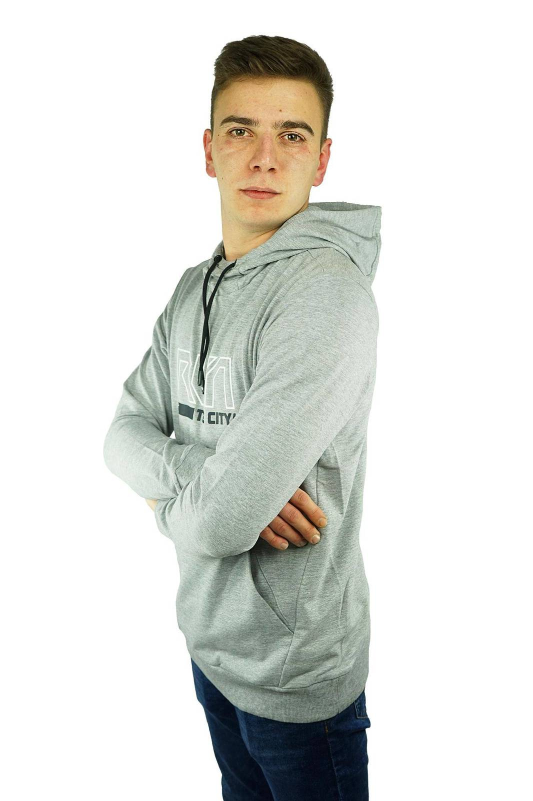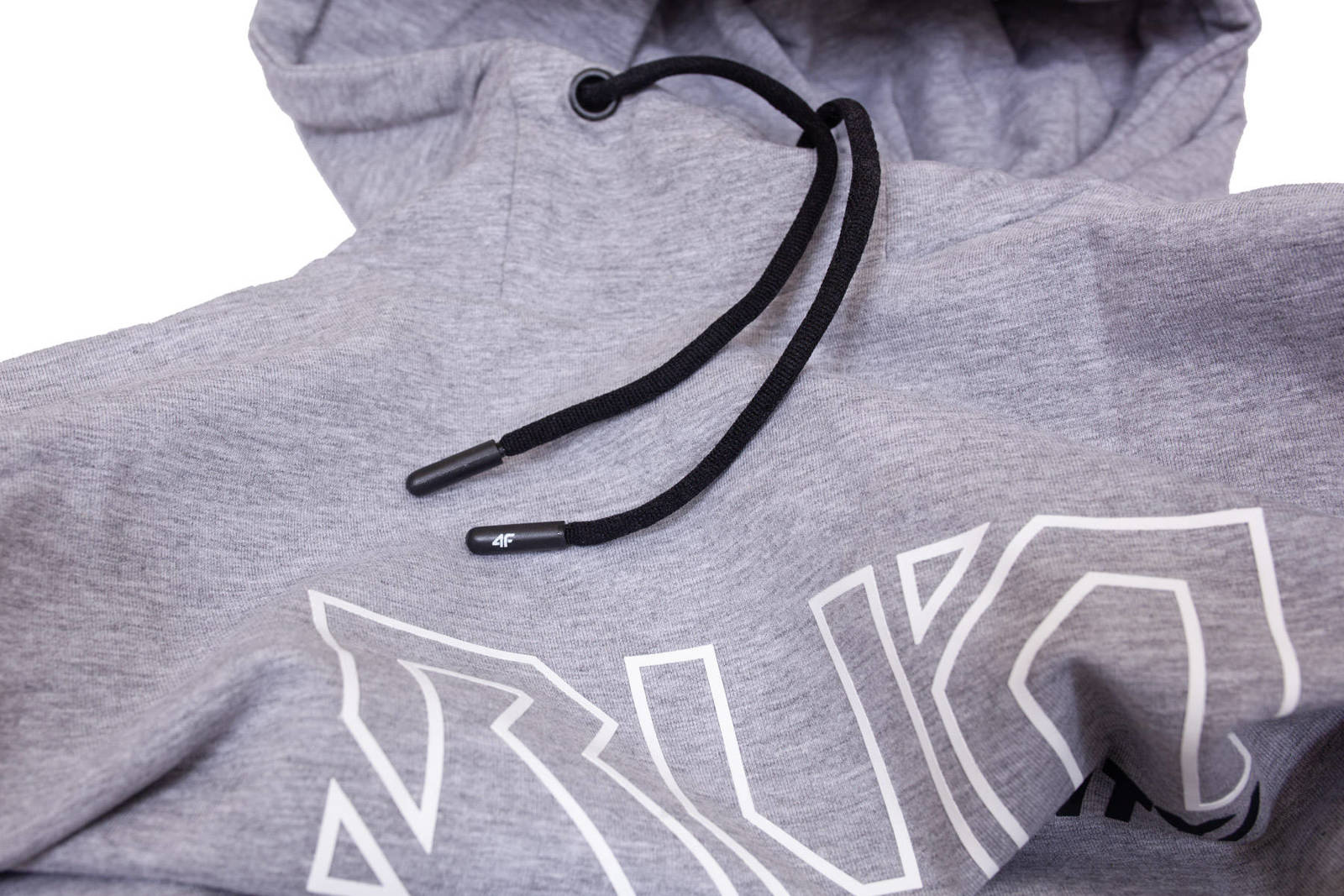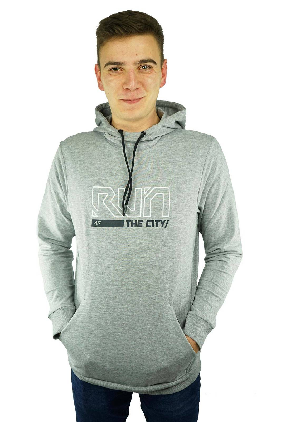 Bluza męska polskiej marki 4F w kolorze szarym uszyta z miękkiego materiału z wysoką zawartością bawełny. Do jej wykonania użyto najwyższej jakości tkanin - 90% bawełna, 5% elastan, 5% wiskoza, co zapewnia naturalny przepływ powietrza. Bluza idealnie sprawdzi się na co dzień jak i do aktywności fizycznych podczas chłodnych dni. Klasyczny krój świetnie dopasuje się do każdego rodzaju sylwetki. Na dole oraz na rękawach umieszczono mankiety, a z przodu znajduje się duża kieszeń. Dodatkowym atutem jest zintegrowany, dwuwarstwowy kaptur z możliwością regulacji, który ochroni głowę podczas chłodnych dni. Standardowy design przełamany został dużym biało - czarnym nadrukiem “run the city” oraz minimalistycznym logiem producenta, co nadaje unikatowości. Produkt jest nowy, posiada oryginalne metki.