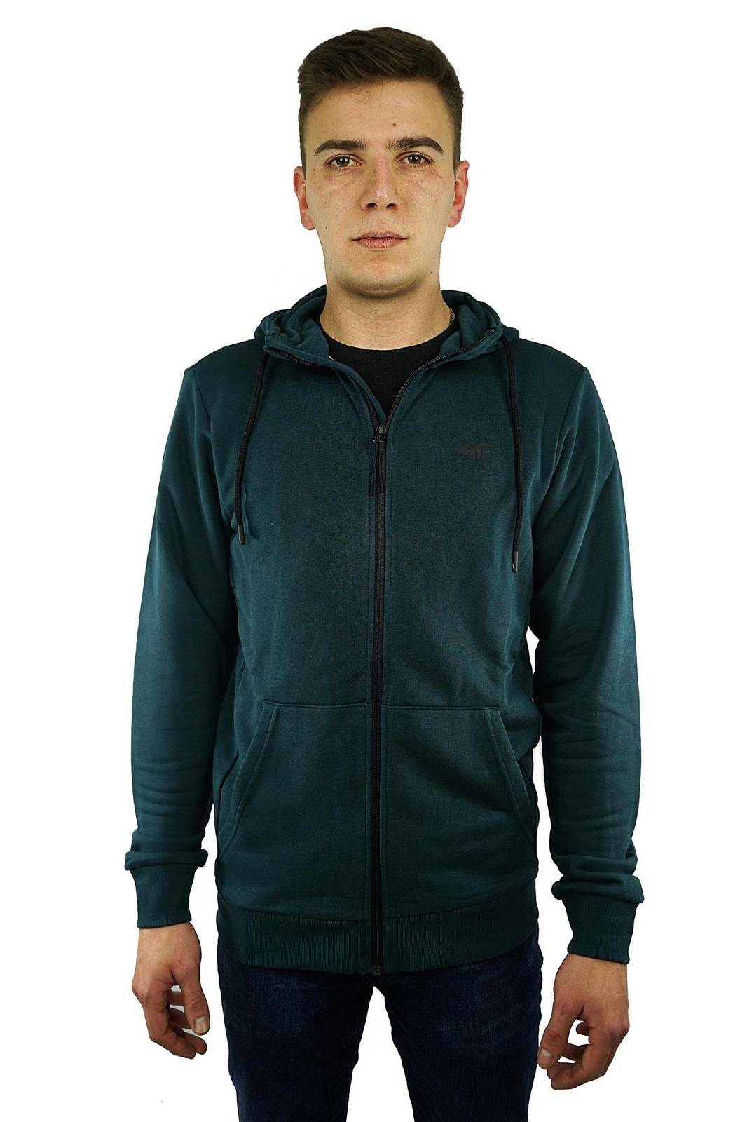 Bluza męska polskiej marki 4F w kolorze zielonym, wykonana z najwyższej jakości materiałów - 73% bawełna, 23% poliester, 4% wiskoza. Rozpinany, klasyczny krój świetnie sprawdzi się zarówno do chodzenia na co dzień jak i podczas aktywności. Materiał jest miły w dotyku, wzbogacony w antypilingowe wykończenie, co zapobiega mechaceniu się i zachowuje estetyczny wygląd przez długi czas użytkowania. Wyposażona w zintegrowany kaptur, który ochroni głowę przed wiatrem oraz zimnem. Posiada ściągacze u dołu oraz na rękawach, dzięki czemu pozostaje ona na miejscu nawet podczas intensywnego treningu, dodatkowym atutem jest zamek poprowadzony przez całą długość bluzy. Po bokach umieszczono dwie otwarte kieszenie. Jest to idealne uzupełnienie garderoby, na tyle uniwersalne, że świetnie sprawdzi się zarówno w okresie wiosenno letnim, jak i jesienno zimowym jako warstwa wewnętrzna. Produkt jest nowy, posiada oryginalne metki.