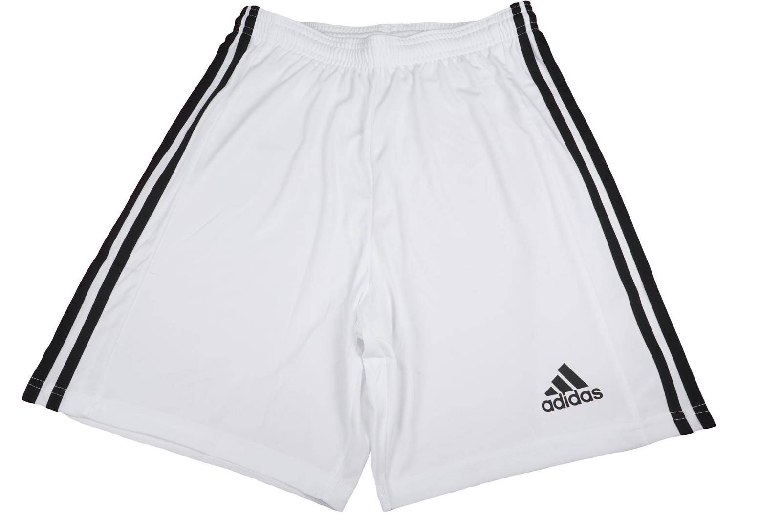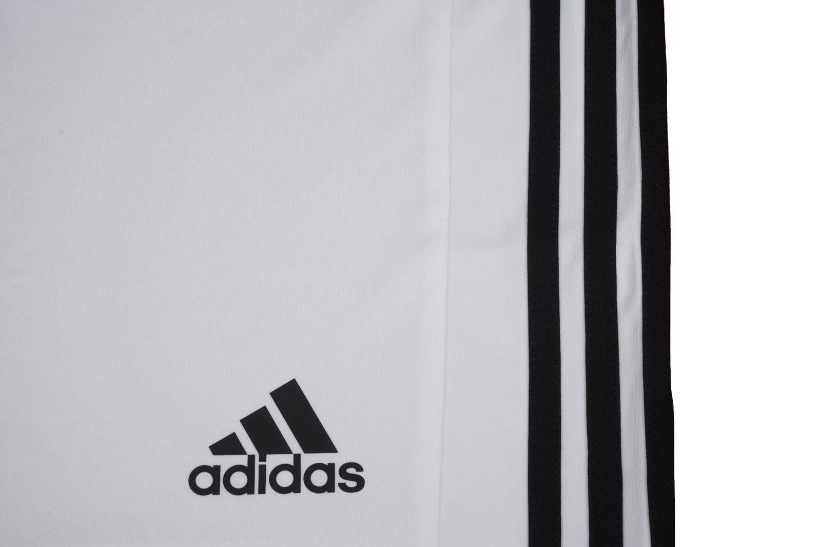 - Męskie spodenki marki Adidas w kolorze białym z czarnymi paskami po bokach. Wykonane zostały w 100% z poliestru pochodzącego z recyklingu. Posiadają luźny krój oraz regulowany pas w talii.